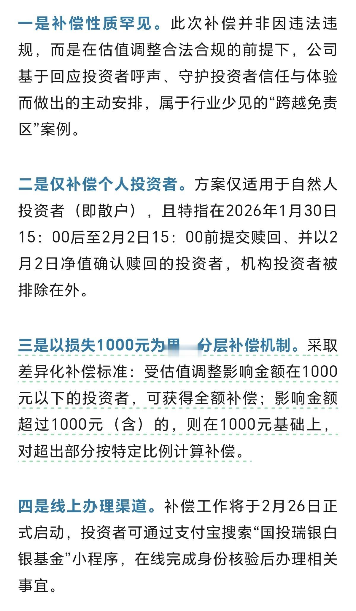 国投瑞银白银LOF的补偿方案终于来了,对于1000元以下的损失全额补偿。这对于投资者来说是一个好消息,终于在投资者们不懈的努力中,挽回了自己的损失,这可以说国内的投资者补偿损失的第一次。可以说是罕见。 而且这次投资者补偿,是针对个人投资者的,同时还是可以通过线上办理,可以说开了一个好头,这种投资者损失补偿,有朝一日,可以运用到财务造假导致上市公司退市,造成投资者损失补偿上面就好了。