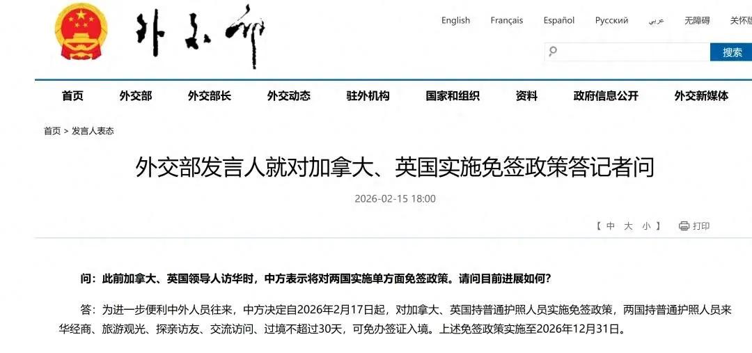 中国外交部刚发布重要消息:2026年2月17日(本周二)起,咱们国家对加拿大、英