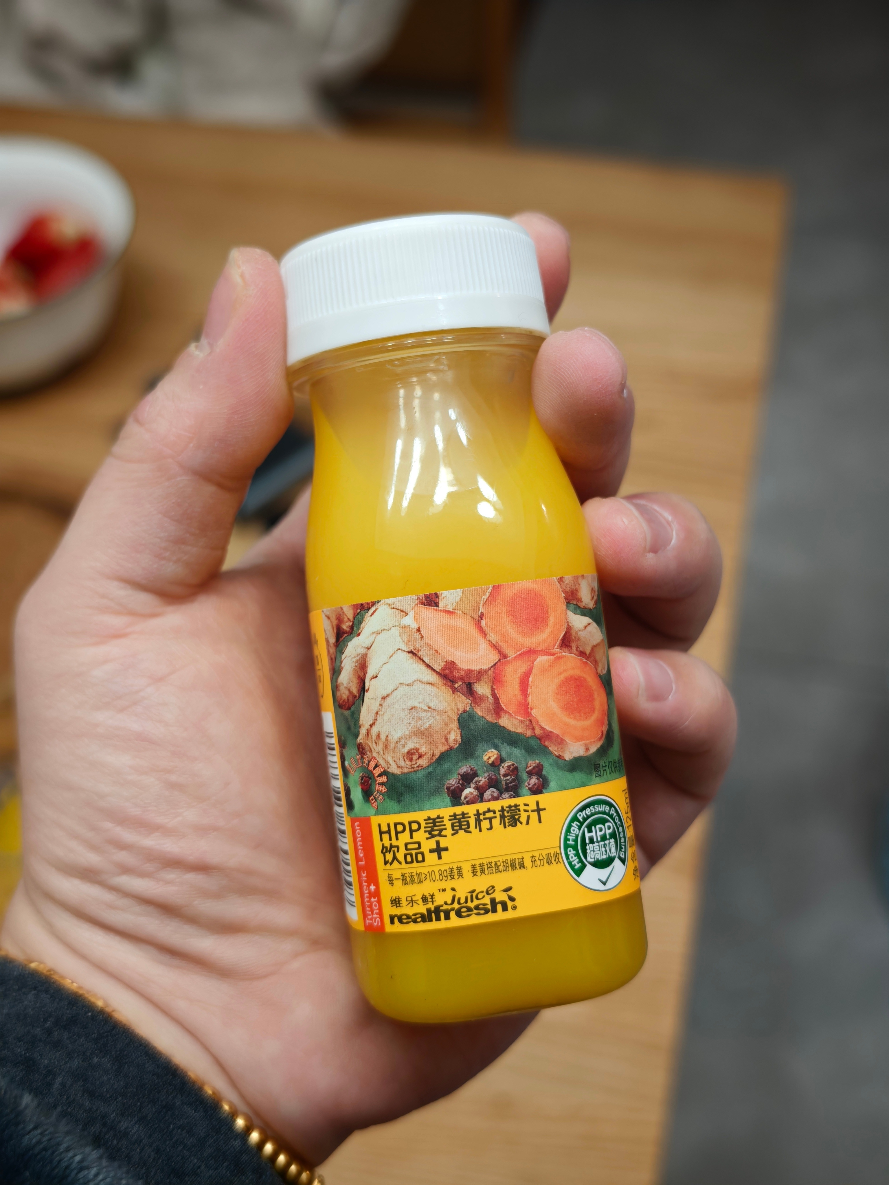 山姆买的姜黄柠檬汁,45.9块钱6瓶,非常小的一瓶,一开始不知道喝了一口,感觉灵魂nmd被从身体里面抽出去之后在天上甩了一圈又被扔回到身体里面,最后还是选择兑了气泡水,瞬间好多了。