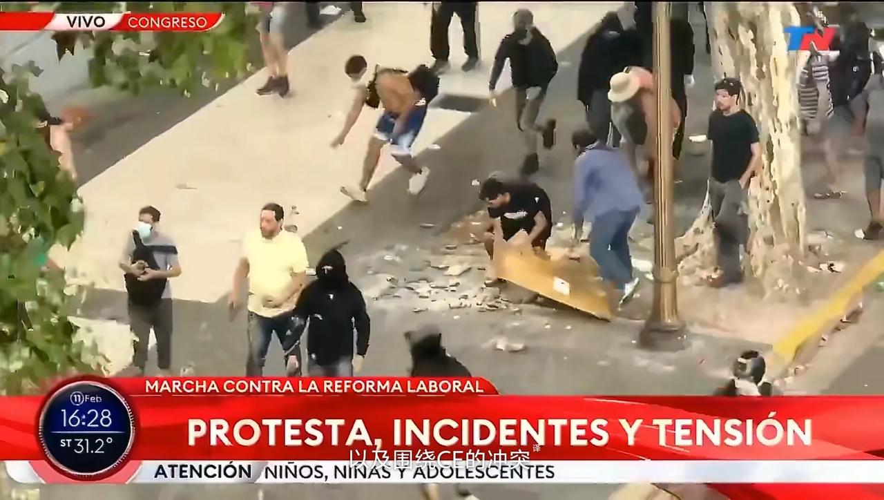 阿根廷总统哈维尔·米莱通过了一系列反劳工权益的改革,将工作日延长了50%,也就是一天要工作12个小时,而且允许公司用食宿代替工资来补偿员工(也就是加班不给钱)。此外,新政策还有延长试用期、简化解雇程序、降低遣散费标准、限制罢工权、减少假期和事故赔偿等。一句话,新的所谓改革完全是讨好老板、压榨工人的。 这个改革政策出台之后,阿根廷工人一下子就炸了,立即走上首都布宜诺斯艾利斯街头进行示威抗议。与此同时,左翼人士、普通老百姓也走上布宜诺斯艾利斯街头抗议。 很快,示威者就与警察发生冲突。示威者把人行道上的行道砖拆了,并且敲碎,然后向警察投掷。此外,各种瓶子甚至燃烧瓶也向警察扔过去。警察则用橡皮子弹、催泪弹、水炮来驱散示威者。双方打得很激烈,有数百人受伤(主要是示威者),还有数十人被警察逮捕。 阿根廷人选择米莱上台,指望他能带领阿根廷走出困境,结果现在发现自己选上来的竟是个活阎王。#阿根廷总统米莱#