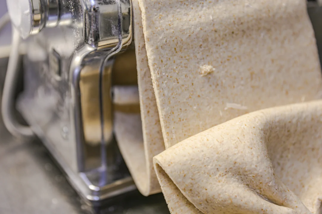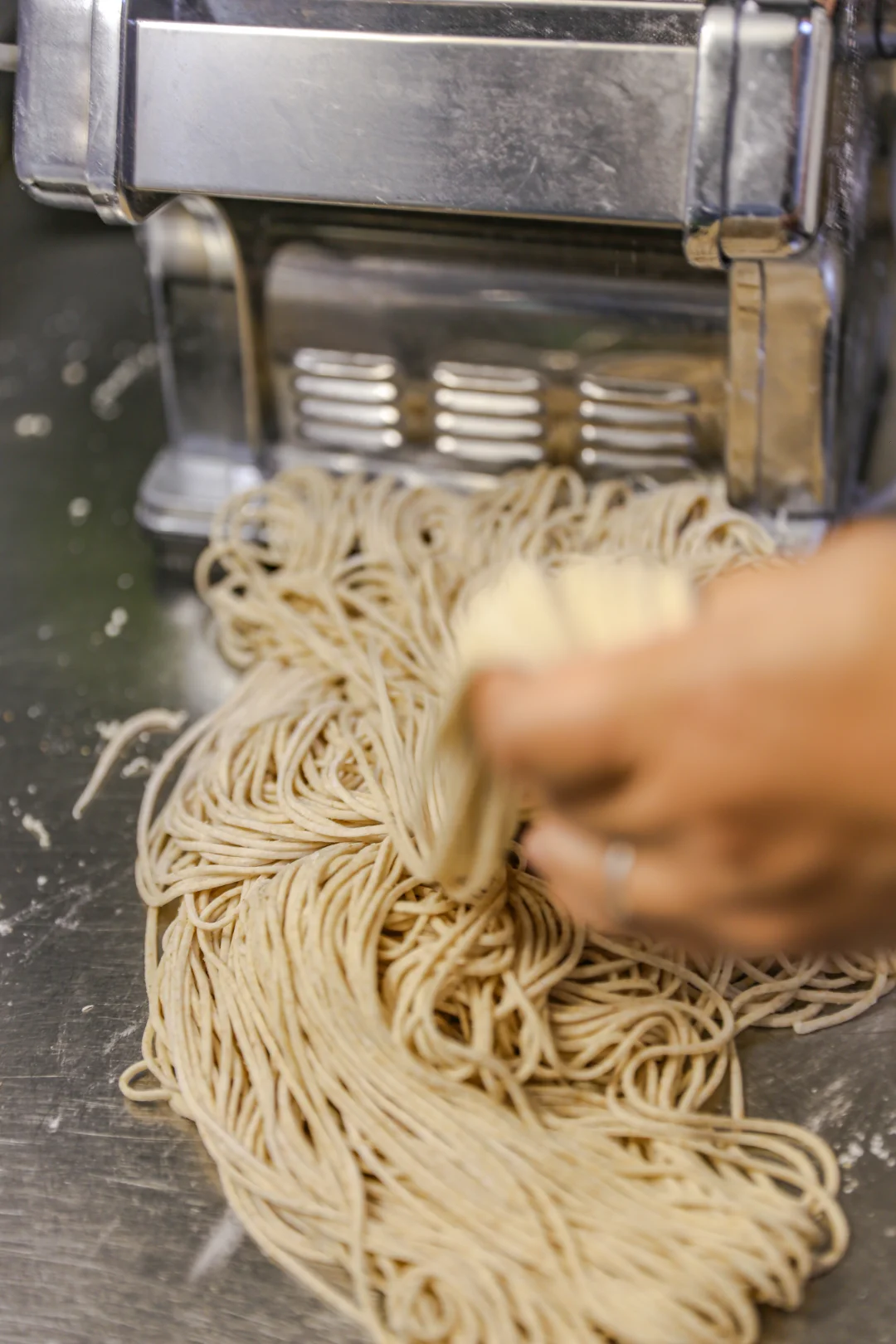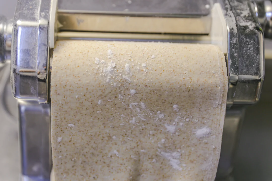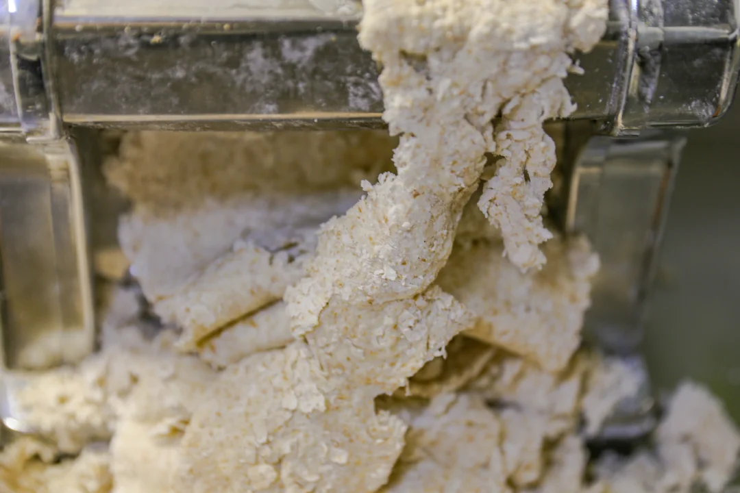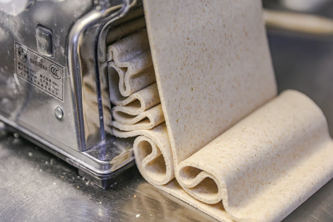 4.第二遍压制的时候把不规则面片继续放进去,来回反复加面絮,慢慢就会成长长的不光滑的面片。