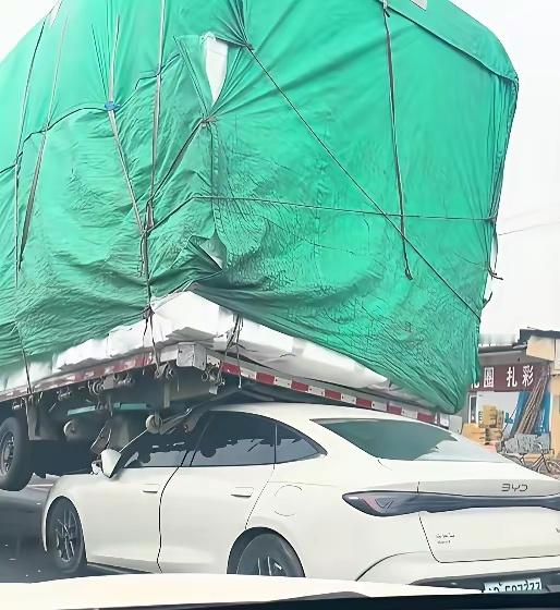 BYD比亚迪的质量真是谜一样的“硬核”!10万块的车,竟像坦克般把整个卡车顶了起
