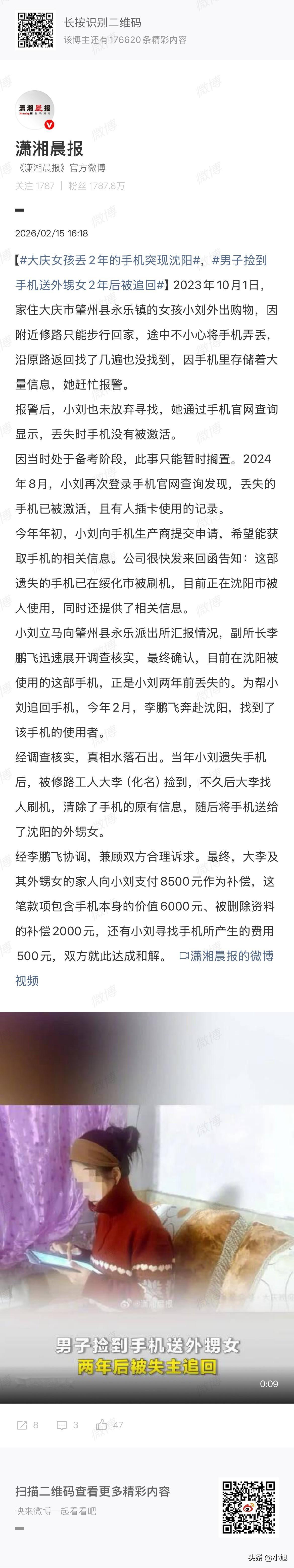破防了。大庆一个女孩,两年前丢的手机,前两天在沈阳被人找到了。 手机是2023年10月1号丢的。那天她出门买东西,附近修路,只能步行回家。走着走着,手机没了。原路返回找了好几遍,没有。 她报了警,自己也一直在查。登录手机官网,显示没被激活。那时候她在备考,这事就先放下了。 2024年8月,她又上去查了一次。这回不一样了。手机被激活了,还显示有人插卡在用。她等到今年年初,直接找手机生产商申请,要这手机的信息。 厂家给了回函,手机在绥化被刷过机,现在在沈阳,有人正在用。连地址都有。她把材料交到派出所。副所长李鹏飞接的案,查了一圈,确认了,沈阳那部手机就是她两年前丢的。 今年2月,李鹏飞去了趟沈阳,找到用手机的人。一查才知道,这手机转了好几道手。当年她丢手机的时候,被一个修路工人捡到了。那人叫大李,捡到不久就找人刷了机,把里面信息全清掉,然后送给了在沈阳的外甥女。 外甥女用着挺好,一用就是一年多。她压根不知道这手机是咋来的。警察找上门,事情才算清楚。 最后协调下来,大李和他外甥女那边,一共赔了8500块。手机本身值6000,被删掉的那些资料赔了2000,还有500是女孩这两年找手机花的钱。 这事在网上传开以后,评论区吵得挺热闹。有人说,捡东西不还,刷机送人,赔钱活该。也有人说,外甥女有点冤,她真不知道是捡的。还有人说,两年了,手机还能追回来,这女孩太有毅力了。 其实按民法典,捡到东西不还,还刷机处理掉,这叫侵占。失主要有证据,可以去法院起诉。诉讼时效是三年,她正好赶上了。律师也说了,手机被偷或者被侵占,不光要还手机,有损坏还得赔修复费。要是里面有重要资料,恢复资料花的钱也能要。她这2000块资料赔偿,就是这么来的。 两年时间,手机从大庆到绥化,刷一次机,再到沈阳,被人用了那么久。她一直没放弃,隔三差五上去查。最后厂家一封回函,警察跨省跑一趟,手机追回来了,钱也赔了。 你看完这事啥感觉。换你,你会查两年吗。评论区聊聊。