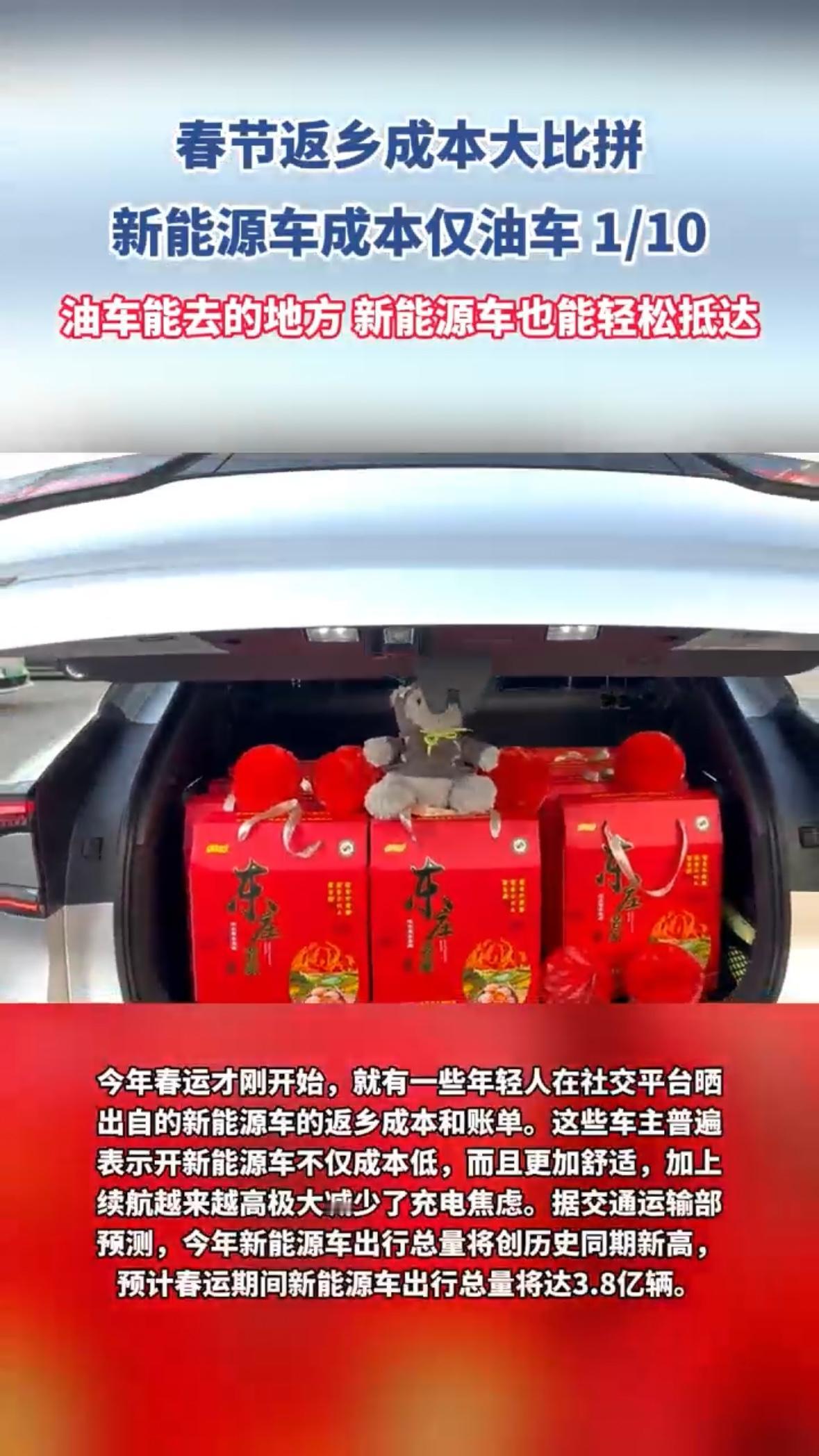 春节返乡成本大比拼,新能源车成本仅油车1/10。据交通运输部预测,今年春运新能源车出行总量将达3.8亿辆,创历史同期新高,越来越多人选择开电车回家过年。 有小鹏G7超级增程车主算了一笔账:去年开油车回老家花了一千多,今年开G7只花了一百多,费用相当于只有去年的10%。之所以能做到这么省,靠的是百公里电耗仅14kWh、馈电油耗低至5.9L,加92号汽油就能跑。更关键的是综合续航高达1704km,全球最长,极大减少了充电焦虑。省钱之外,智能舒适的驾乘体验也让长途返乡更轻松。省钱又舒服,难怪成为春运返乡的热门选择。