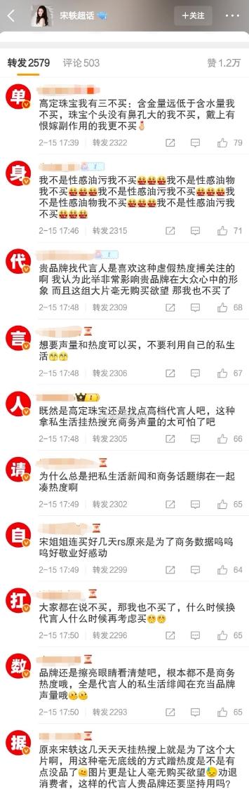 白敬亭粉丝屠了宋轶的代言! 白敬亭和宋轶俩人上了好几天恋情向的热搜了,俩人谁也没有公开回应,但是宋轶换背景的操作被很多人认为是故意气白敬亭粉丝,现在粉丝觉得是宋轶为了商务自己炒作的恋情,所以在商务代言平均区排字抵制,目前品牌方已经把最近几天关于宋轶的评论区给关闭了。