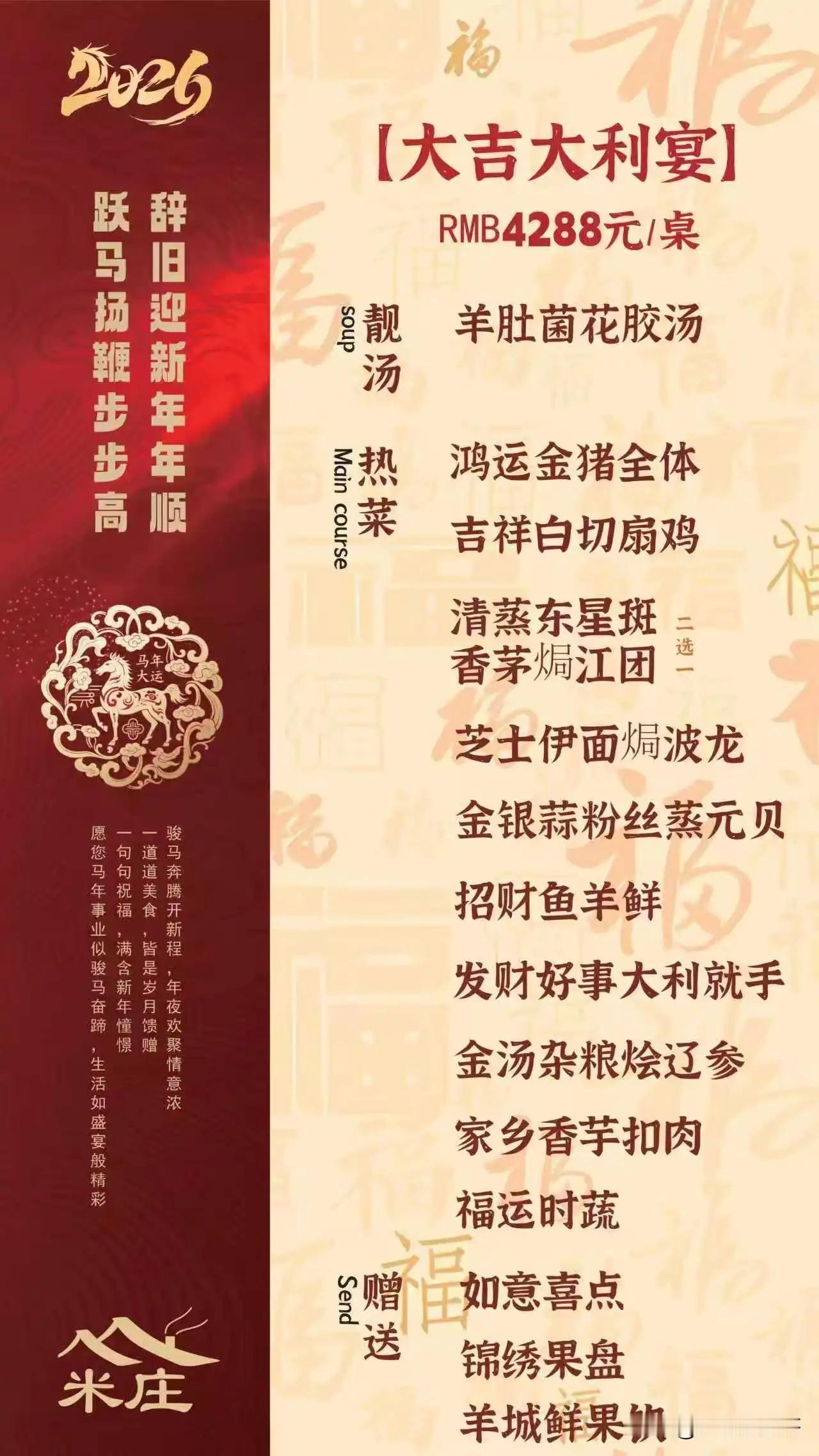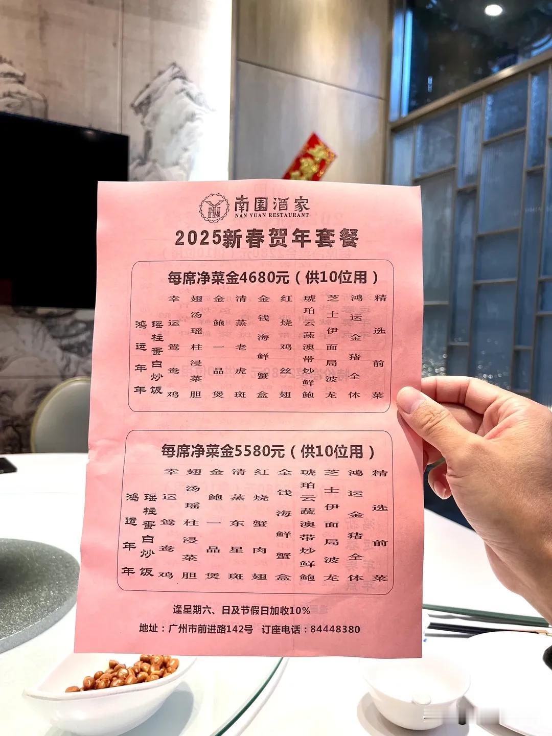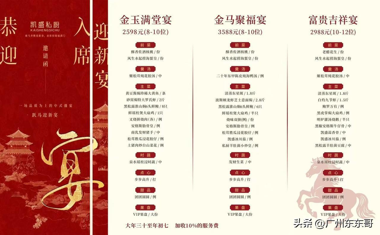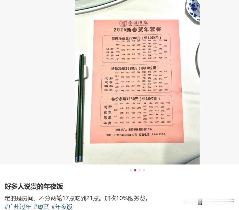 广州人的年夜饭,今年又上涨了不少! 广州的传统年夜饭很少自己煮,一般都是出去酒楼搞定,省时省力。一家大细齐齐整整、团团圆圆的聚完餐后行花街。 看了一下几家餐厅酒楼的菜单今年的年夜饭更贵了,加上最高15%的服务费,最贵的每人1932元,最便宜的四人餐每人起码也要240元,并且要提早预订,通常一晚两轮是常态,生意火爆的三四轮也是有的。稍热门的食肆/座位,全靠抢!而且,订金和菜色得提前确定,现场极可能没得加,是不是预制菜也是见仁见智了。 年夜饭是吃了,吃的好不好,吃的饱不饱,还真难说。 不知道广州街坊,今年你们的年夜饭吃了多少,这波春节物价上涨,是不是在你的接受范围之内呢?
