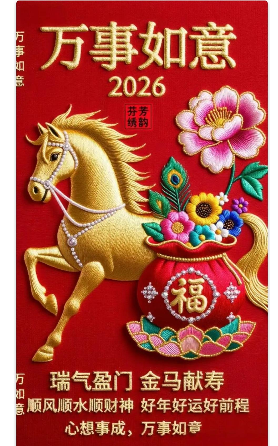 金马扬蹄,踏碎旧岁的尘埃;春风得意,奔赴明日的山海。 2026,愿你以梦为马,不负韶华。祝前程似锦,马到成功!心中所想皆如愿,脚下所行皆坦途。新年万事胜意,阖家安康!踏歌赴新岁 金马迎春 扬蹄骏马 金马呈祥 蹄声催奋进 金马吉祥对联