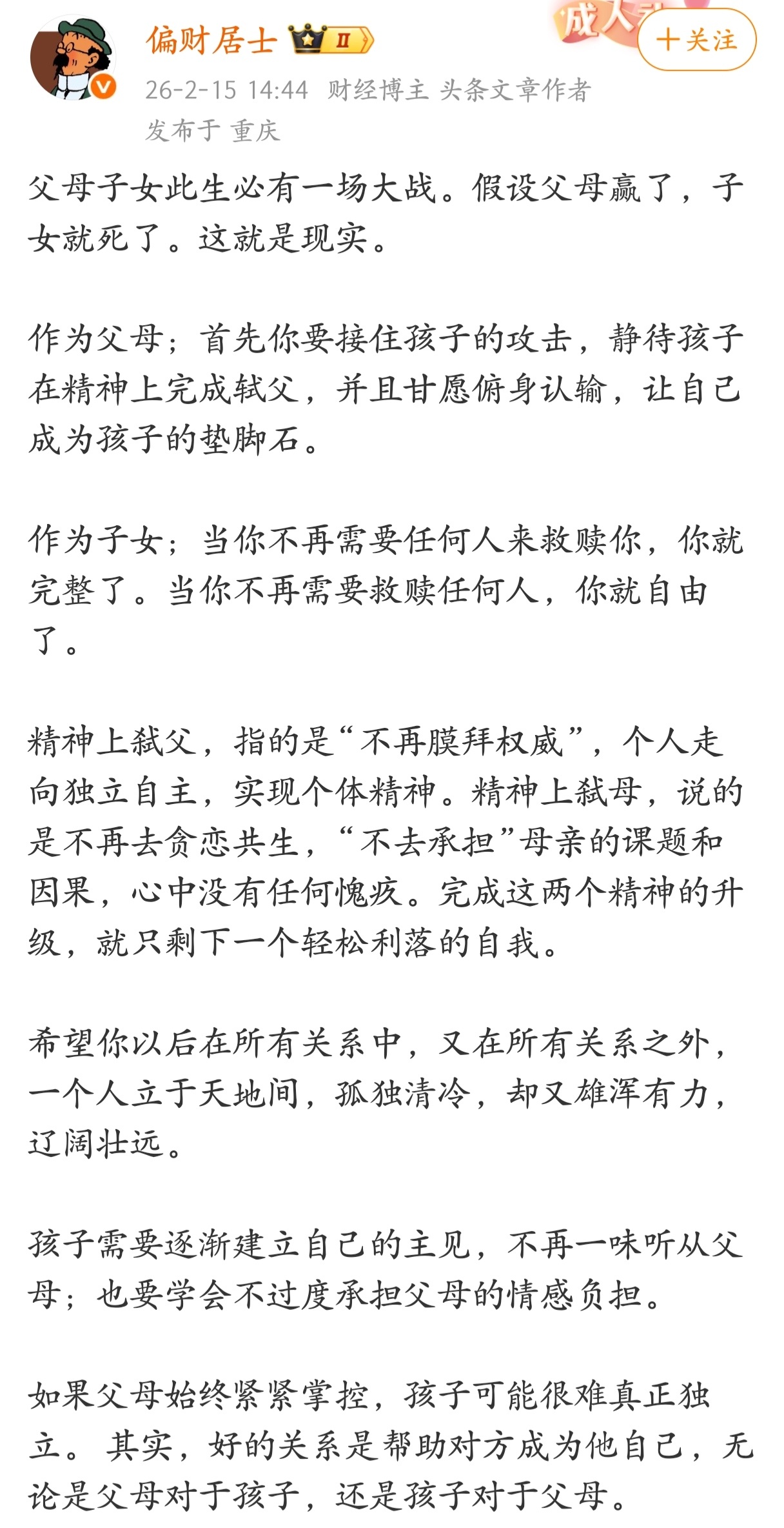 父母子女此生必有一场大战。假设父母赢了,子女就死了。这就是现实。