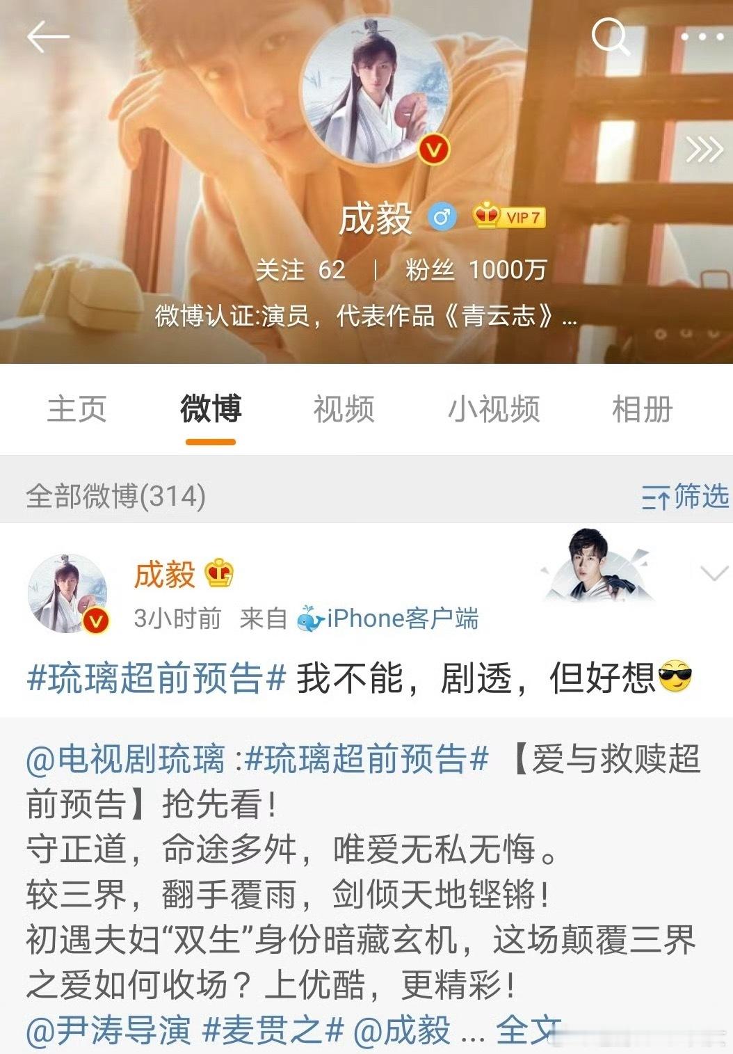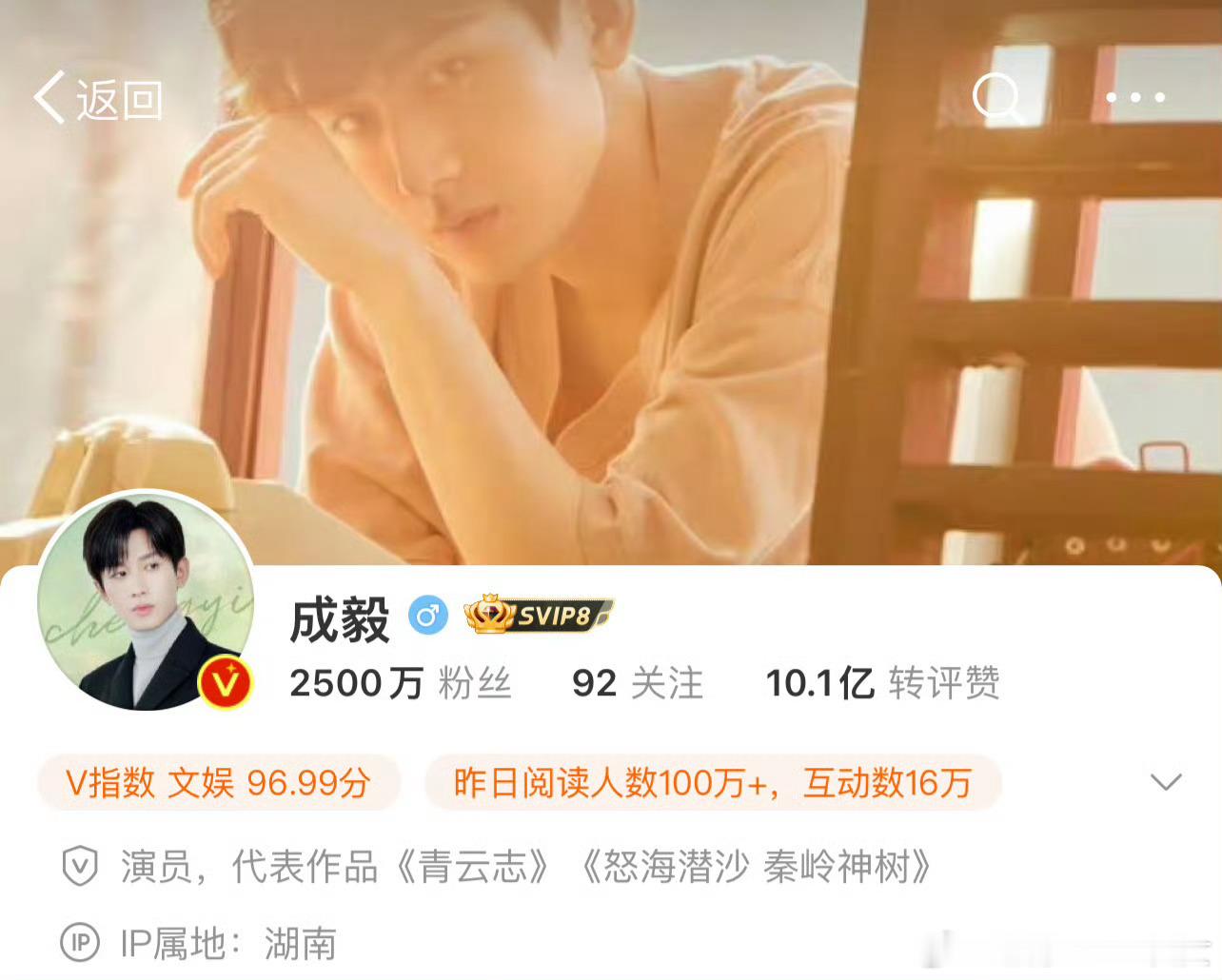 成毅粉丝破3000万啦,三部剧有效播剧大吸粉,两京十五日杀青物料大出圈,涨粉非常明显,太牛了。《琉璃》时破1000万,如今破3000万,成毅每一涨粉都是实实在在用作品和角色垒起来,没有营销,没有刻意的营业,只有一部接一部的戏,一个又一个让人记住的角色,一步一个脚印,恭喜成毅