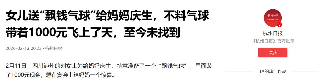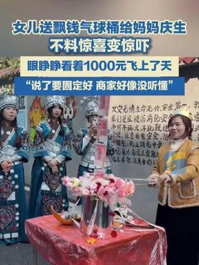 “亏大了!”2月11日,四川泸州,一女子为了给妈妈生日惊喜,便往气球上挂了1000元,没想到妈妈亲手拆开时,气球没有用绳子绑住,缓缓往天上飞去,当时众人都没反应过来,只能眼眼睁睁看着1000元就这么没了!网友:捡到的人有福了! 刘女士为了给妈妈一个压轴惊喜,特意找人定制了一个“飘钱气球”,就是在红色的橡胶气球下面,挂了一沓红彤彤的钞票,整整一千块人民币,她想着等到寿宴进行到高潮,让妈妈亲手解开牵引绳,看着气球带着钱慢慢飘起来,既喜庆又有心意,妈妈肯定会特别开心,也能让在场的宾客们眼前一亮。 毕竟是花了心思准备的惊喜,刘女士也考虑到了安全问题,她在定制气球的时候,反复叮嘱店家,一定要把气球底部固定死,还要做好配重,不能让气球轻易飞走,在她看来这要求一点都不过分,毕竟是要挂着一千块钱的,做好固定是最基本的常识,也是商家该有的职业素养,她嘴皮子都快磨破了,就怕出什么意外。 寿宴当天一切都很顺利,宾客们吃得开心,也纷纷给老太太送上祝福,老太太脸上一直挂着笑容,特别欣慰,终于到了揭晓惊喜的时刻,刘女士把那个挂着一千块钱的气球递到妈妈手里,告诉妈妈,解开牵引绳,就能看到惊喜,老太太满心欢喜地接过气球,心里满是期待,她以为气球下面连着底座,或者至少有个秤砣,只要轻轻一解,就能看到不一样的惊喜。 可谁也没想到,意外就在这一刻发生了。老太太轻轻解开手里的牵引绳,手里一松才发现所谓的“固定”根本不存在,商家压根就没做好配重,也没把底部固定好。氦气的浮力从来都不开玩笑,挂着一千块钱的气球,瞬间像脱缰的野马一样,挣脱了老太太的手,在几百双眼睛的注视下,慢悠悠地往天上飞去,越来越小。 现场所有人都懵了,出现了几秒钟的真空期,大家都盯着那个带着钱的气球,一时之间没反应过来。本来该有的欢呼和惊喜,瞬间变成了阵阵叹息,刘女士站在一旁,估计肠子都悔青了,她怎么也没想到,自己反复叮嘱的事情,还是出了纰漏,精心准备的惊喜,竟然变成了一场尴尬的意外。 等到大家反应过来的时候,气球已经变成了天空中一个小小的红点,越来越远最后彻底消失在了视线里,连一点痕迹都没留下,几百双眼睛,原本都齐刷刷地盯着寿星和菜肴,此刻却都整整齐齐地行着“注目礼”,看着那个急速缩小的红点,眼里满是惋惜,那可是整整一千块钱啊,就这么飞走了,换谁看了都会觉得亏大了。 一千块钱,说多不多,说少也不少,对谁来说都不是大风刮来的,尤其是刘女士,这钱是用来给妈妈庆生的,是一份心意,结果就这么白白飞走了,心里的委屈和惋惜,可想而知,气球飞了之后,刘女士的第一反应就是报警,她心里还抱着一丝希望,想着能不能有办法找回来,可她也清楚这基本上是不可能的。 大家也都明白,警察能怎么办呢?总不能给风开罚单,也不能全城布控,去拦截一个小小的气球,这分明就是一个无解的局,报警之后定制气球的商家也出面了,姿态做得倒是很足,主动提出退全款,再额外赔偿刘女士200元,想着尽快把这件事解决掉。 可在刘女士看来,这几百块钱的赔偿,简直就是在伤口上撒盐。她缺的不是这两百块钱,也不是定制气球的全款,她缺的是那个被毁掉的、不可复制的瞬间,是妈妈本该收获惊喜的笑容,是自己精心准备的心意,这些东西从来都不是靠转账就能抹平的,所以她毫不犹豫地拒绝了商家的赔偿。 让人没想到的是这场意外里,最该生气的老太太,反而看得最通透,面对飞走的一千块钱,老太太坐在饭桌上,乐呵呵地挥了挥手,一点都没往心里去,还反过来安慰女儿,让她别往心里去,周围的人都在为飞走的钱惋惜觉得太亏了,可老太太却看得很开,只当是图个热闹没什么大不了的。 后来刘女士看着妈妈豁达的样子,也慢慢释怀了。既然钱已经找不回来了,再纠结、再生气也没用,不如换个心态看待这件事,她在社交平台上发了一段话,说自己不找了,谁捡到那一千块钱,就是谁的运气,还祝福那个“天选之子”能开心,这句话也得到了无数人的点赞。 这件事被传到网上后,网友们也纷纷热议,有人替刘女士惋惜,说“真的亏大了,好好的惊喜泡汤了”,也有很多人调侃“捡到的人也太有福了,天上掉馅饼”,其实说到底,刘女士确实亏了,亏了一千块钱,也亏了精心准备的惊喜,但她也收获了妈妈的豁达和大家的理解,而那飞走的一千块钱,或许也能给某个陌生人,带去一份意外的温暖,也算是另一种圆满吧。