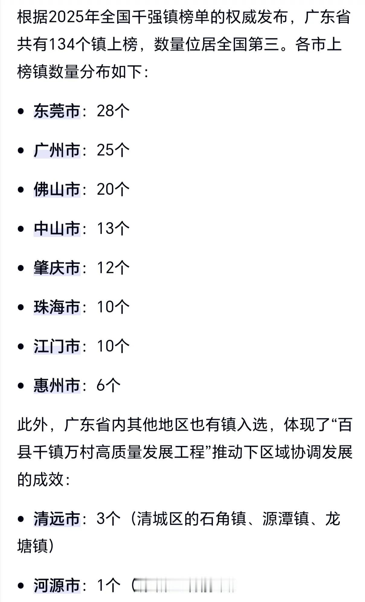 全国千强镇,经济第一省广东仅列第三,还比不上浙江;江苏等于广东和山东之和;湖南不但远远落后于湖北和江西,而且比不上广西;辽宁、四川、湖南等传统大省的千强镇只有个位数,比广东经济中游的几个市还要少。