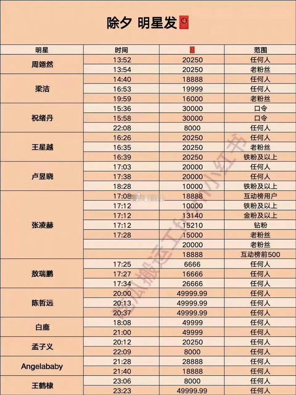 除夕红包分组 2026红包分组除夕夜竟然有这么多明星发红包吗 那我可要蹲好了 大家都定好闹钟了吗 白鹿 红包金额
