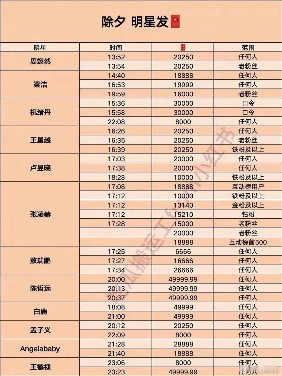 明星发红包,时间排得满,周翊然13点,梁洁14半,祝绪丹15点,口令别念乱,王星越16点,老粉别偷懒,卢昱晓17点,铁粉有加餐,张凌赫17点,钻粉金粉看,敖瑞鹏17半,连发三波赞,陈哲远20点,数字带小数点,白鹿21点,孟子义22点,Angelababy21点,王鹤棣23点,明星轮番发,手速要跟上,红包雨不停,好运滚滚来!绕口令念完,红包抢一半,除夕夜不闲,钱包鼓得圆!