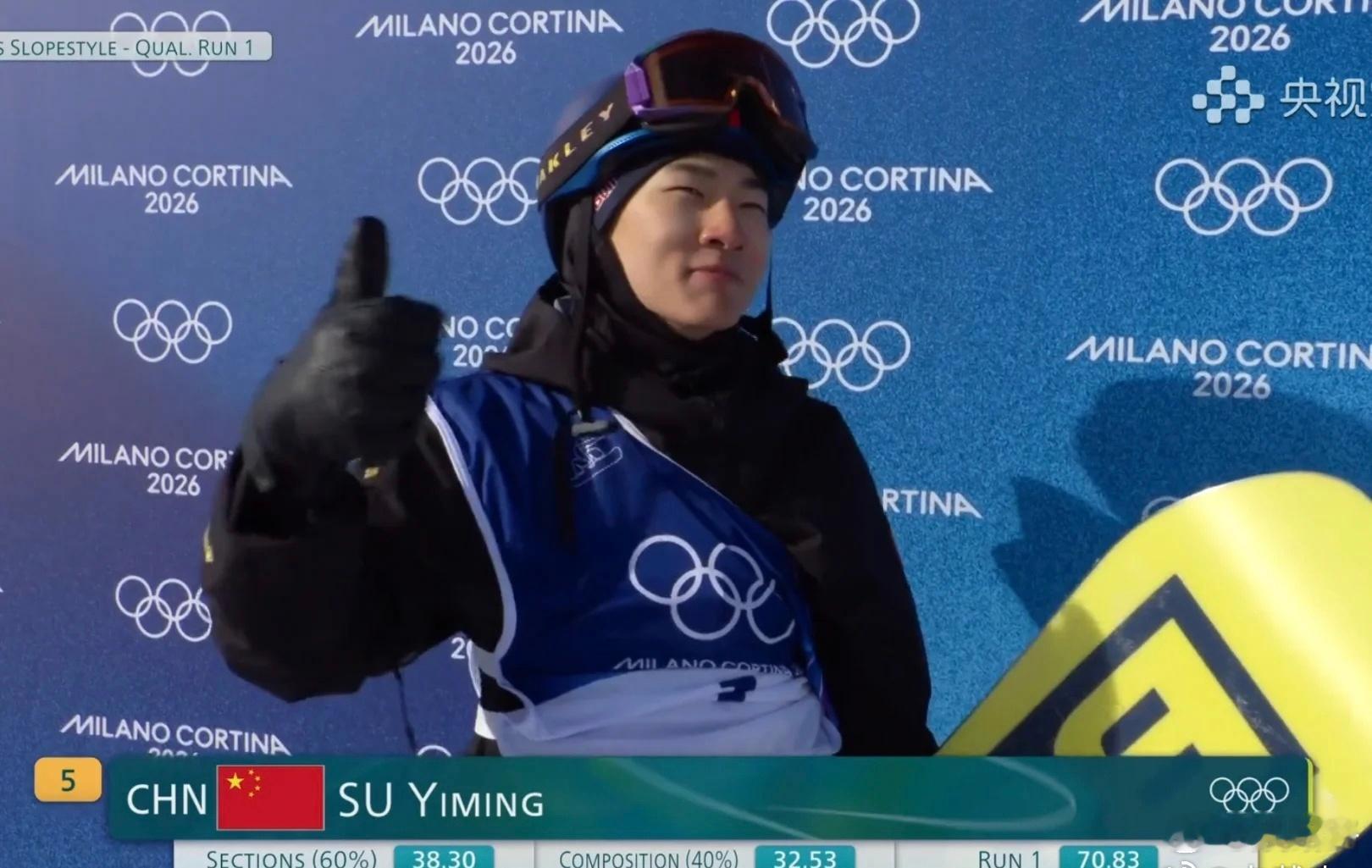 终于看到卸下卫冕压力的苏翊鸣啦!✨在单板滑雪男子坡面障碍技巧预赛里,第一滑拿下70.83分,滑完对着镜头比心的瞬间,真的又飒又暖。