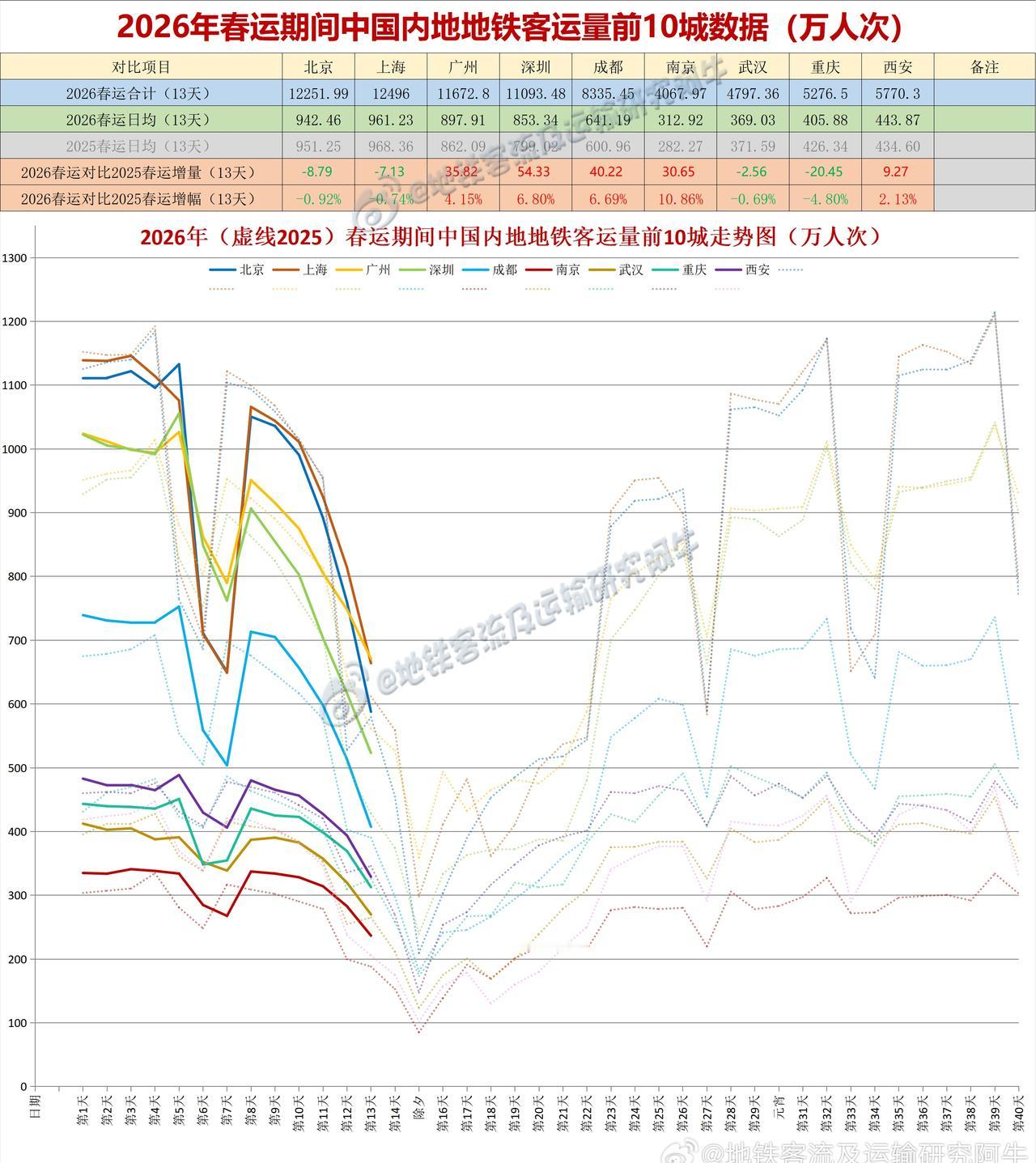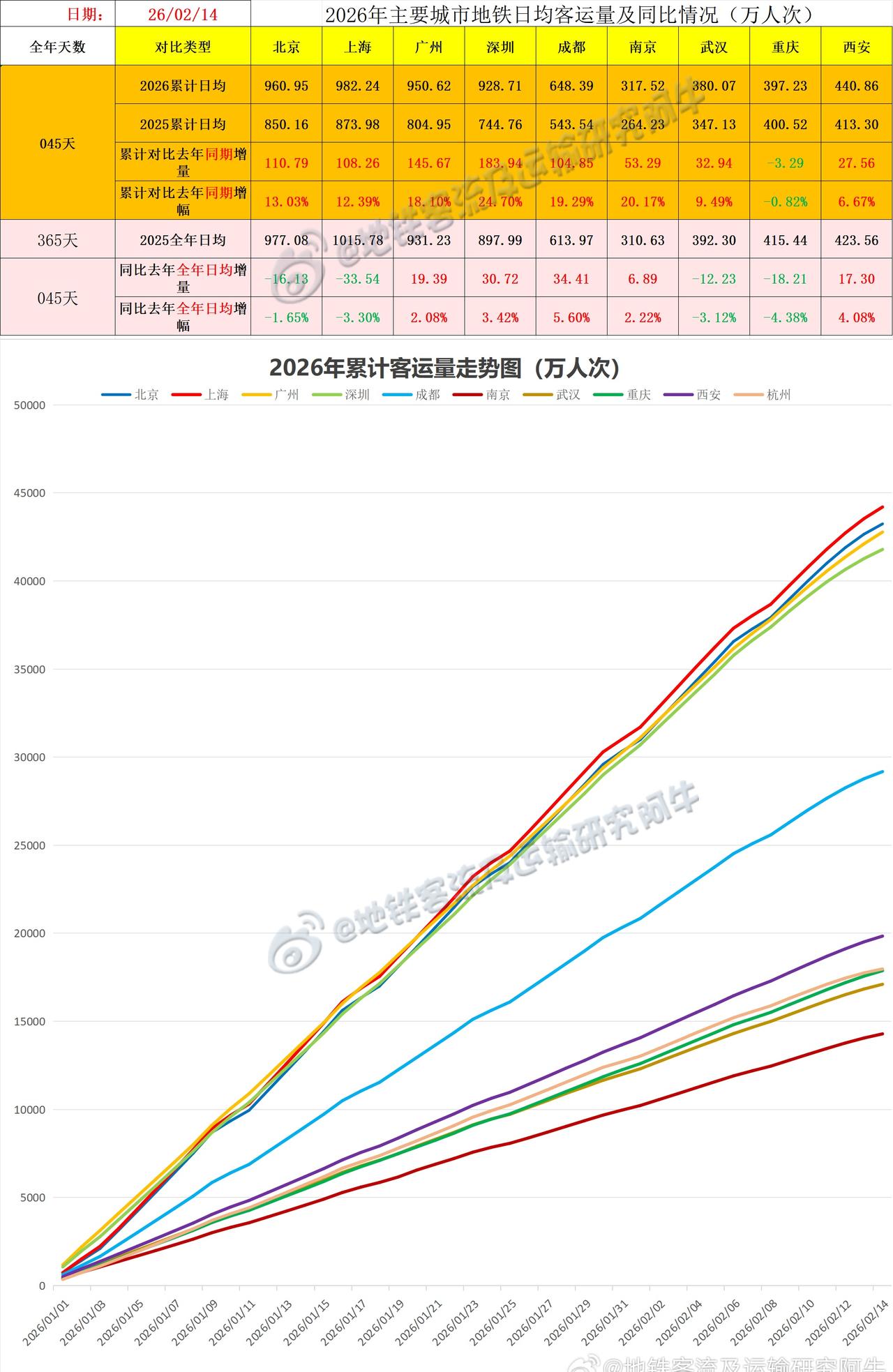 【中国城市地铁客流排行榜 2026-02-14(周六上班,农历腊月廿七,春运第1