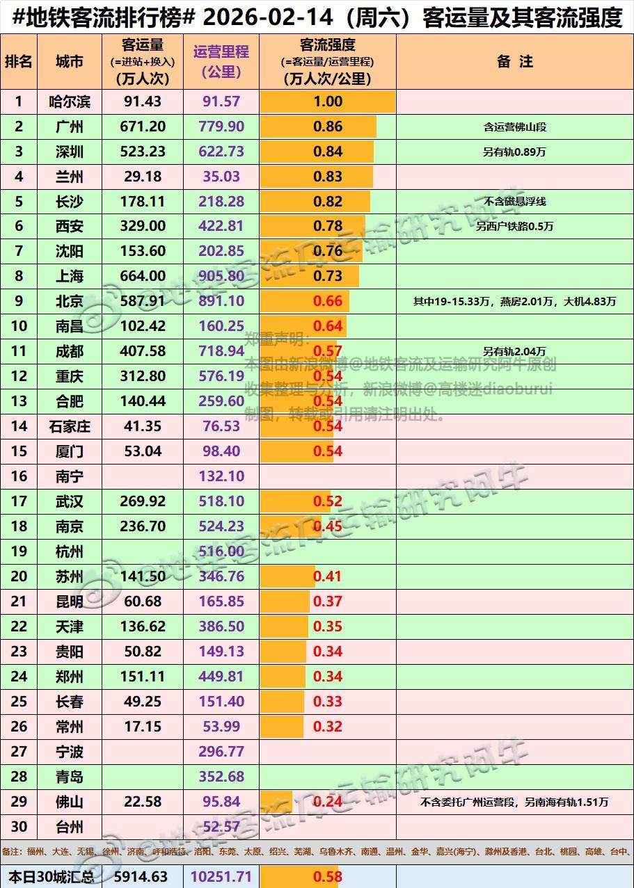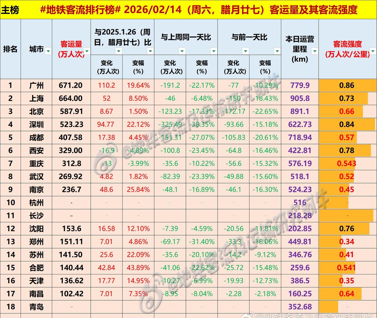 【中国城市地铁客流排行榜 2026-02-14(周六上班,农历腊月廿七,春运第13天,中国地铁客流日报】 广州671.2万, 上海664万, 北京587.91万(其中19-11.34,燕房1.85,大机4.72), 深圳523.22万(另有轨0.75万), 成都407.58万(另有轨1.65万), 西安329.0万(另西户铁路0.5万), 重庆312.8万, 武汉269.92万, ……余见下表(1-客运量排序,2-客流强度排序)