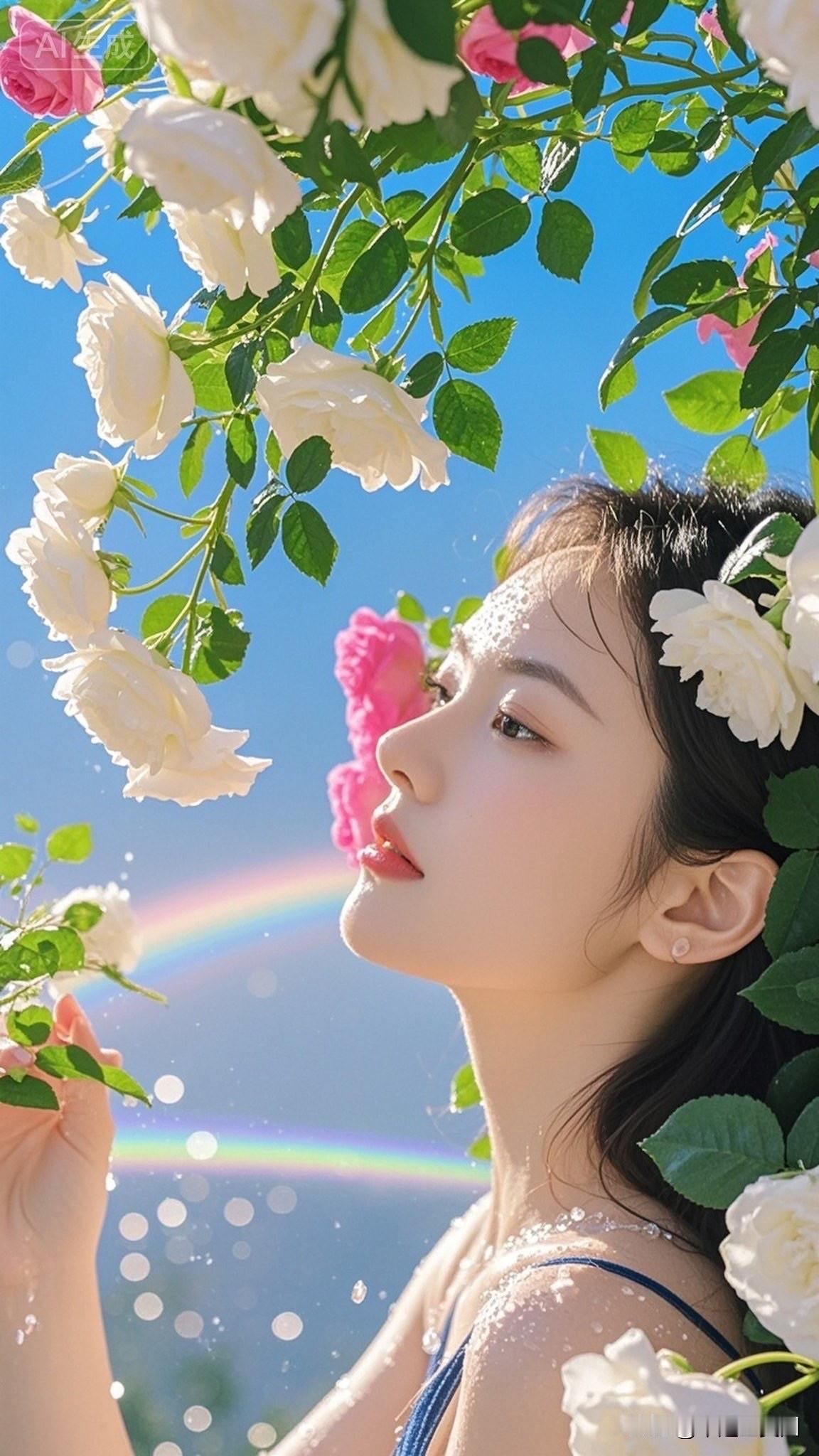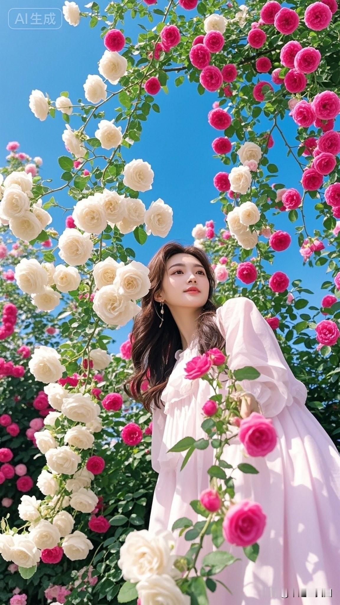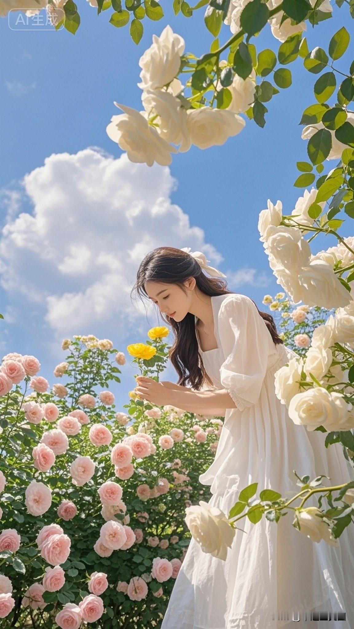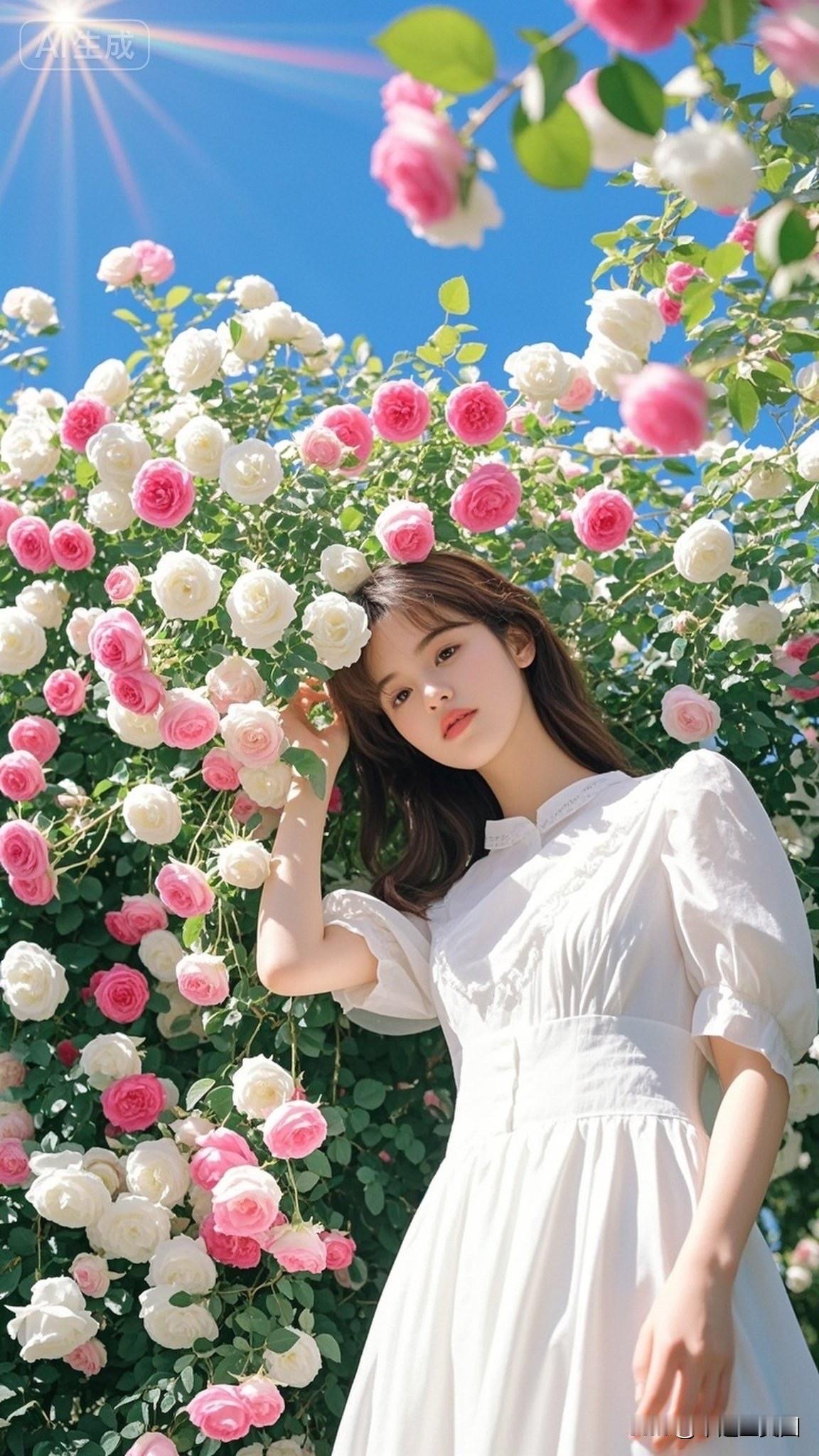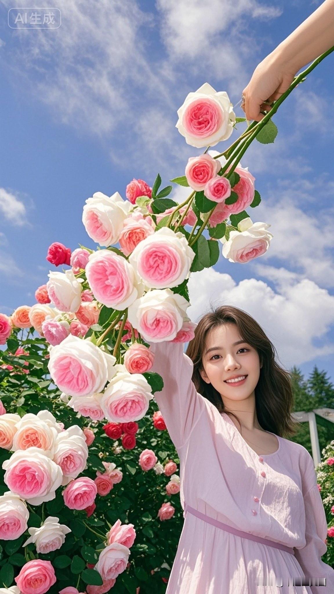 少女与玫瑰的浪漫邂逅,阳光下的甜美笑容