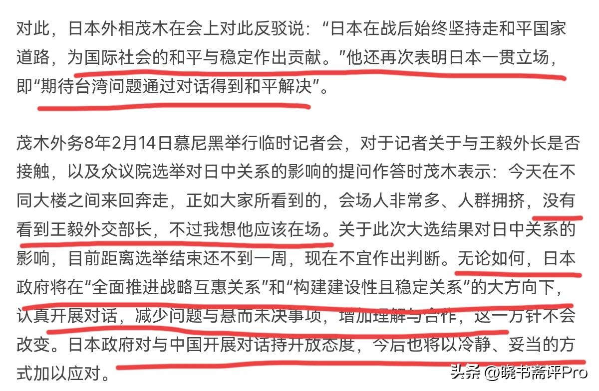 日本态度变了!日本声称,期待台湾问题通过对话得到和平解决。在王毅外长对日本警告之后,日本对此进行回应了。2月15日,根据法新社报道,面对王毅外长的批评,日本外务大臣茂木敏充对此表示,日本在战后始终坚持走和平国家道路,为国际社会的和平与稳定作出贡献。期待台湾问题通过对话得到和平解决。 茂木敏充表示,关于此次大选结果对日中关系的影响,目前距离选举结束还不到一周,现在不宜作出判断。无论如何,日本政府将在全面推进战略互惠关系和构建建设性且稳定关系的大方向下,认真开展对话,减少问题与悬而未决事项,增加理解与合作,这一方针不会改变。日本政府对与中国开展对话持开放态度,今后也将以冷静、妥当的方式加以应对。 很显然,在王毅外长对日本进行不留情面的批评之后,日本的这一表态,非常值得玩味。不客气的说,王毅外长的表态,这是逼得日本必须自证清白。其一,日本不得不表态日本会走和平国家道路,打消来自于中国及国际社会的质疑。其二,日本不得不在台湾问题上进行回应,打消外界对其可能武力介入的质疑。 而借着这一回应,茂木敏充声称,要认真开展对话,减少问题与悬而未决事项,增加理解与合作。日本当然有展现日本“负责任”的一面,但这事实上也说明日本有意缓和与我们的关系,不然,日本没必要进行这一番喊话。在慕尼黑安全会议上,茂木敏充没有得到与王毅外长会晤的机会,这说明在我们看来,日本的喊话远不足以改善中日关系。事实上,日本与其辩解,喊话,不然拿出实际行动来。否则,中日关系不可能解冻。