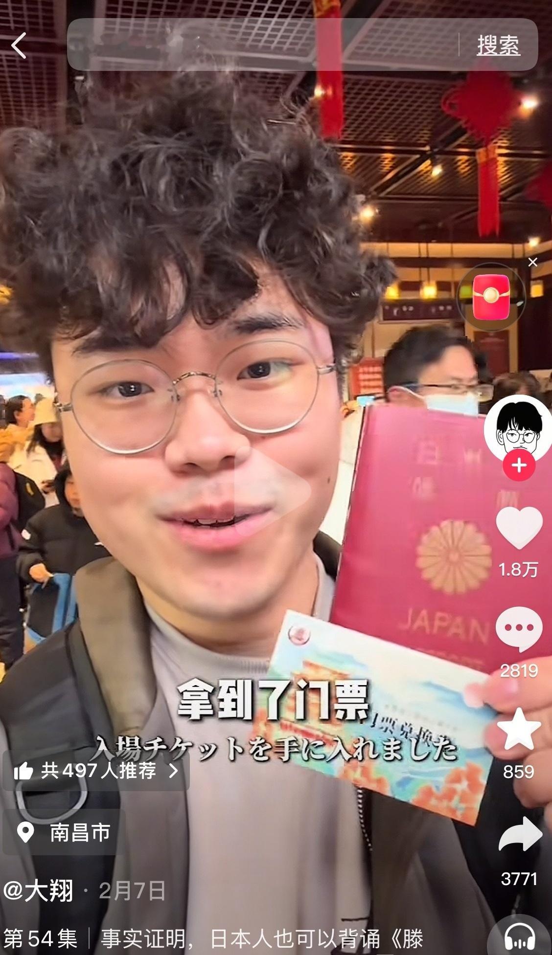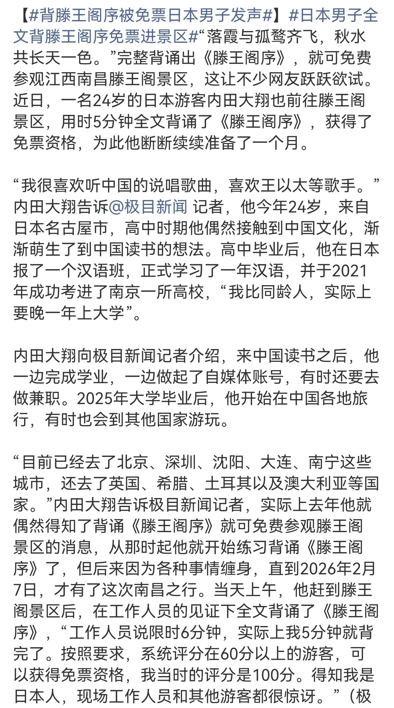 24岁的日本游客内田大翔,仅用时5分钟便全文背诵773字《滕王阁序》,他本人也很喜欢中国文化,为了能免费参观滕王阁景区,他断断续续准备了一个月。