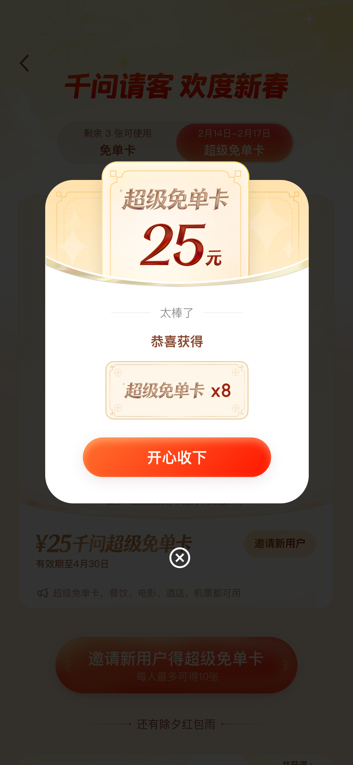 春晚的神喊你上千问领整点红包雨 千问这波是真金白银在撒啊!除夕夜19-22点整点的红包雨到时候疯狂戳屏幕,又能抢到好几个,听说最高2888元,我一定要蹲!!!!还有那个25元超级免单卡我拿去点了炸鸡外卖,餐饮自由get!转发到闺蜜群现在我已经拉了8个新好友,又白嫖了8张超级免单卡,准备攒着订过年出去玩的景点门票。千玺粉丝说的对:跟着代言人走,吃喝玩乐全都有!
