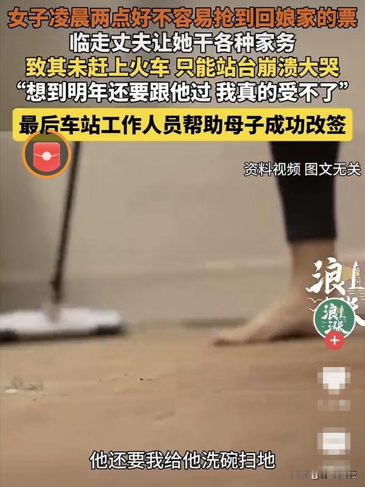 湖南长沙,一远嫁的女子好容易盼到年底,就想带着孩子回娘家过年,熬到凌晨2点半,才好不容易抢到车票。可临出门前,丈夫却故意找茬,一会儿让干这,一会儿让干那,摆明了就是刁难她。女子不想吵架,忍着委屈飞快干完活,结果赶到车站,还是差5分钟没赶上火车,女子当场崩溃大哭,说自己太委屈,一想到还要回去面对这样的人过日子,就受不了。幸好车站工作人员出手帮忙,母子俩成功改签,网友:你该改签的不只是车票,还有自己一辈子的幸福! 谁能想到,一远嫁女子,差5分钟没赶上回家的车,竟在高铁站哭得崩溃绝望。 眼看着火车缓缓开走,她抱着孩子瘫在站台上,一遍遍地哭着喊:我就是很委屈!只差五分钟啊! 这张票,是她凌晨两点半熬着夜、守着手机才好不容易抢到的,就差一点点,就能见到日思夜想的爸妈了。 更让她崩溃的是,一想到回去面对冷漠的丈夫,实在是受不了。 女子自从远嫁过来,任劳任怨,照顾孩子,操持家务,日子过得紧巴,好几年没回过娘家。 一个是离家远,来回方便,再有丈夫也不愿意她回娘家,嫌花销大。 电话里,年迈的父母天天问她啥时候能回家待几天,她心里又酸又愧疚,一口答应今年一定回去。 可春运的票太难抢,她白天要照顾一家人,只能半夜起来刷票,抢到票的那一刻,她激动得眼泪都掉了下来。 出发当天,她早早收拾好行李和礼物,算好了时间,就怕耽误坐车。 可临出门,丈夫却故意找茬,让她干这干那,把家收拾利索,说她心早就飞了,明摆着就是拖延时间刁难她。 女子觉得丈夫好容易吐口让她回娘家,出门图个顺当,不想跟他惹气,忍着委屈飞快干完活。 着急忙慌赶到车站,可还是晚了5分钟,眼看着火车徐徐开走,她急得直跺脚。 她心里比谁都清楚,要不是丈夫故意拦着,她根本不会错过车。 远嫁的苦、想家的痛、丈夫的冷漠,一下子全涌上来,让她彻底绷不住了。 好在车站的工作人员了解情况后,心疼她的处境,帮她改签,终于让她重新坐上了回家的车。 人是顺利回娘家了,可心里的伤却没那么容易好。 有人气不过,这种男人,不值得留恋,过到啥时候也没盼头。 也有人表示,既然选择了远嫁,就得做好思想准备,自己选的,跪着也得走完。 一个远嫁的女人,不求大富大贵,只想过年回娘家看看爸妈,这点小小的心愿,都要被百般刁难。 熬到半夜抢票,满心欢喜准备出发,却被最亲近的人故意拖延,只差五分钟,毁掉了她盼了几年的期待。 她不是没忍,不是没迁就,为了家庭和睦,她默默干活、压着脾气,可换来的不是体谅,而是变本加厉的冷漠。 远嫁本来就赌上了一切,离开亲人、远离家乡,最需要的就是丈夫的心疼和照顾。 可有些人偏偏不懂珍惜,把妻子的付出当成理所当然,连回一趟娘家都要百般阻拦。 车站那一场崩溃,哭的不只是错过火车,更是远嫁的委屈、不被心疼的心酸,和看不到头的日子。 车票可以改签,可人心一旦凉了,就很难再暖回来,希望每一个远嫁的姑娘都能被温柔以待。 也希望所有男人都明白,娶她不是为了拴住她,而是要护着她、成全她,让她在异乡也能有依靠、有底气。 对此,你怎么看呢?欢迎评论留言!