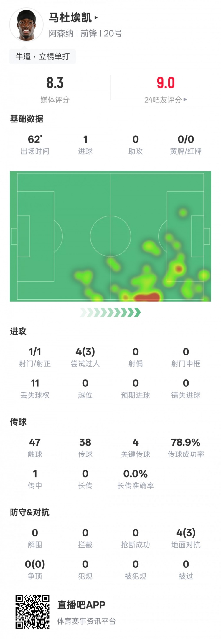 直播吧2月16日讯足总杯第4轮,阿森纳主场迎战维冈竞技。马杜埃凯首发出战,打进1粒进球,送出4次关键传球,3次过人成功,评分8.3。