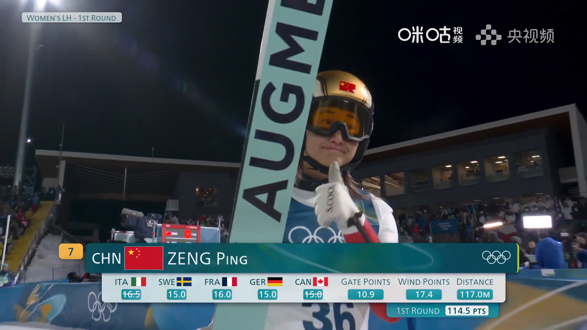 米兰冬奥跳台滑雪女子大跳台第一轮,🇨🇳中国小将曾坪,第一跳顺利完成,分数:114.5,暂列第7。基本锁定决赛轮名额,成绩出来后她竖起了大拇指👍。