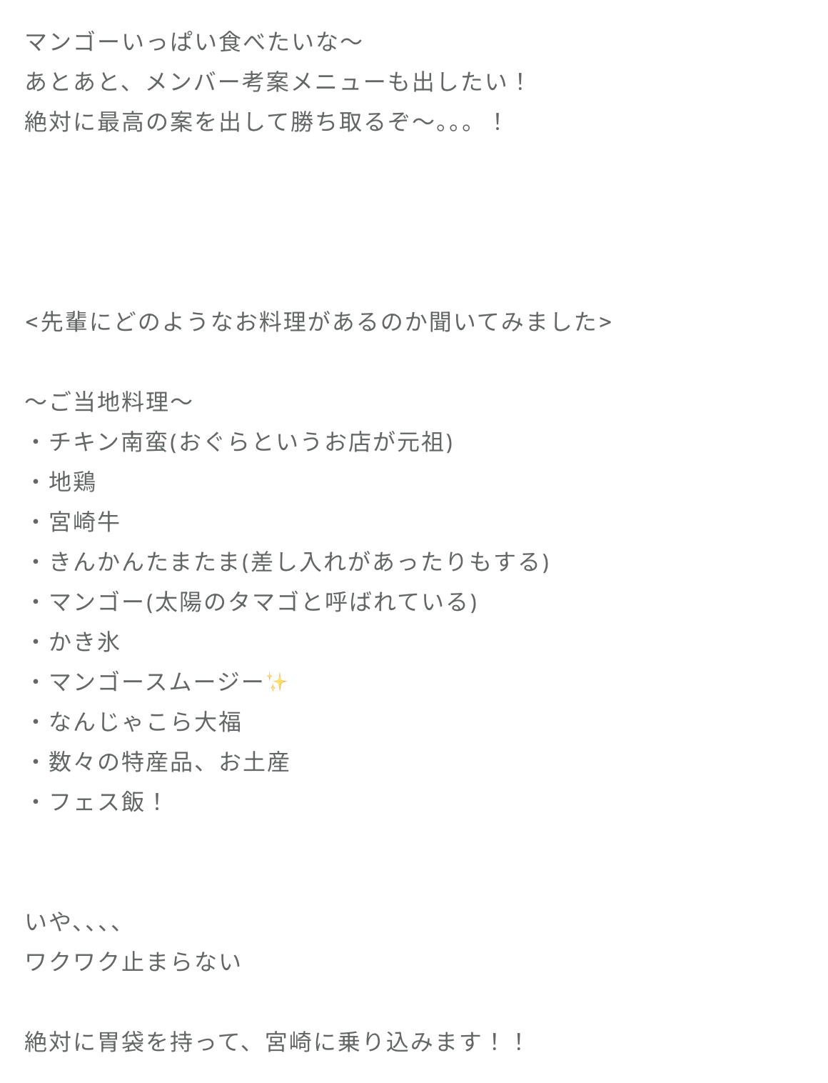 高井俐香「ひなたフェスが発表されてから、宮崎に下見に行ってみることを計画しています。。。ひなたフェスを開催するにあたって、先輩に宮崎について質問したところ、まだまだ知らないことが多すぎることに気づきました(>.<)もっと宮崎のことを知りたい!!って思ったので今度母と行ってこようと思います🥭」