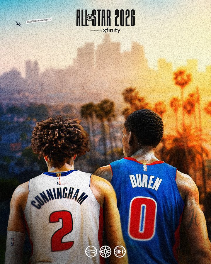 虎扑02月16日讯活塞官方更新X,晒出一张活塞球员凯德-坎宁安和杰伦-杜伦的海报与球迷分享。