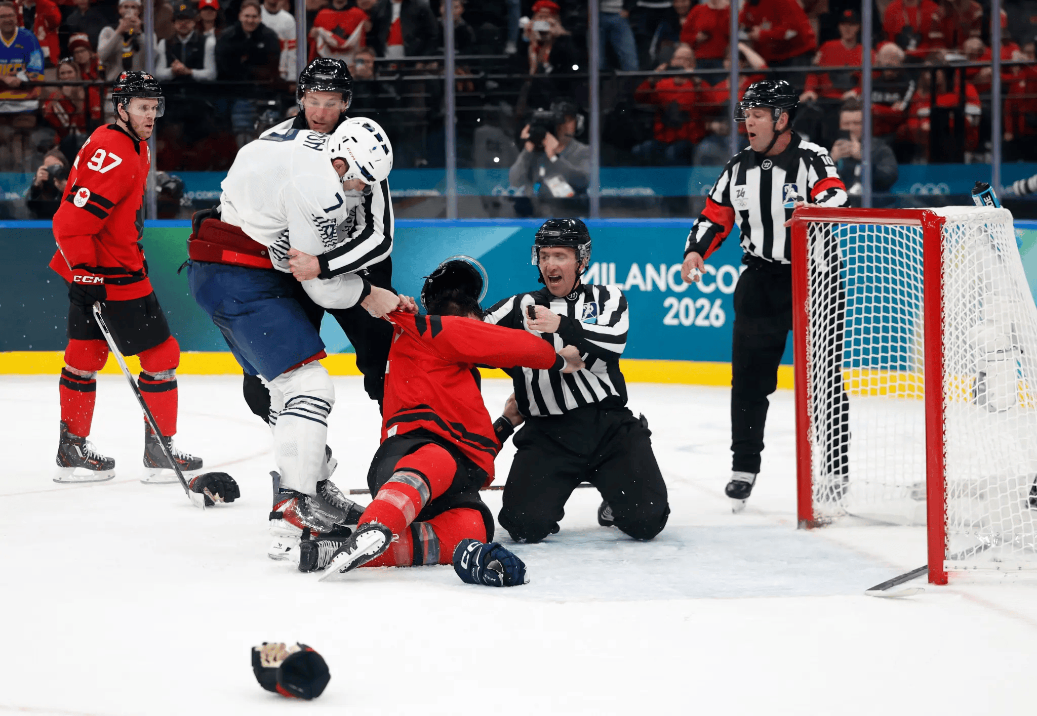 虎扑02月16日讯米兰-科尔蒂纳冬奥会男子冰球小组赛加拿大对法国的比赛末段出现本届赛事首场打架冲突。加拿大前锋汤姆-威尔逊在第三节后段与法国球员皮埃尔-克里农发生肢体冲突并升级为互殴,裁判依据国际冰联规则对双方均做出严厉判罚,两人均被判比赛违纪直接罚下。