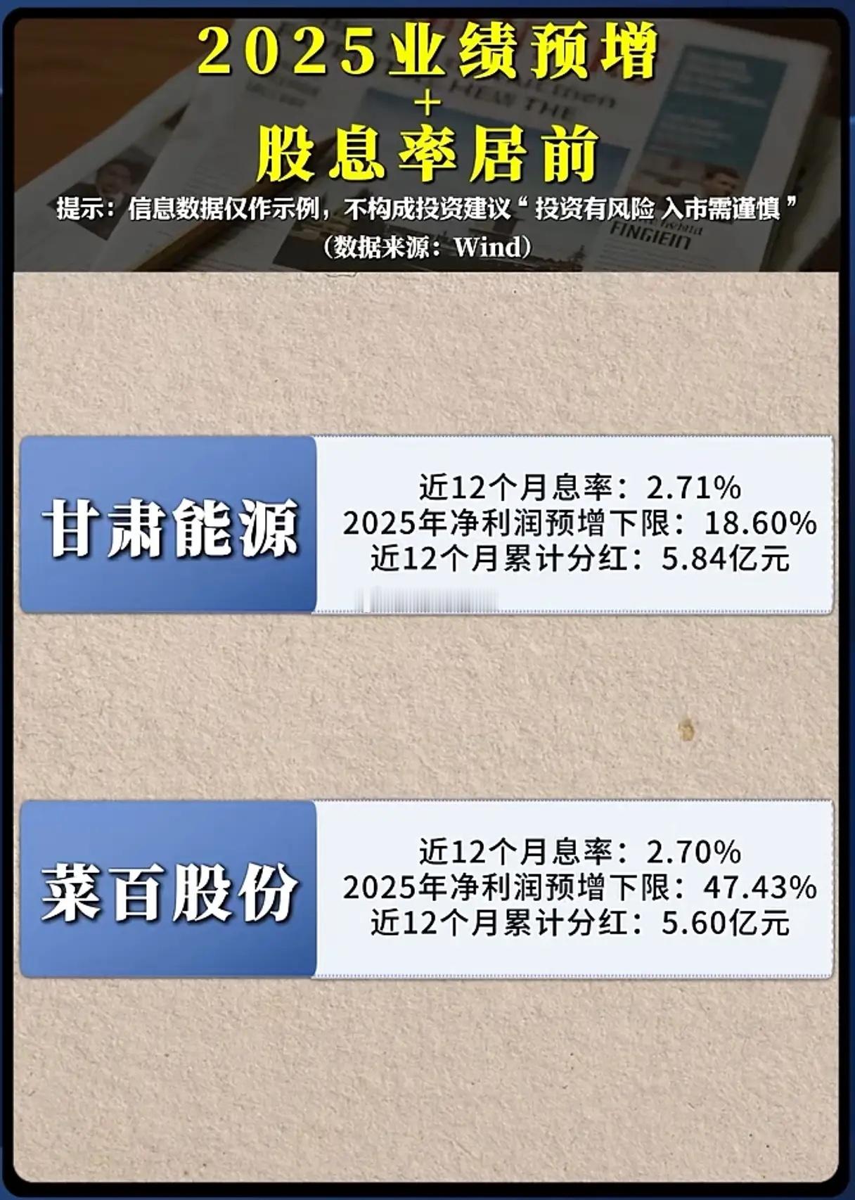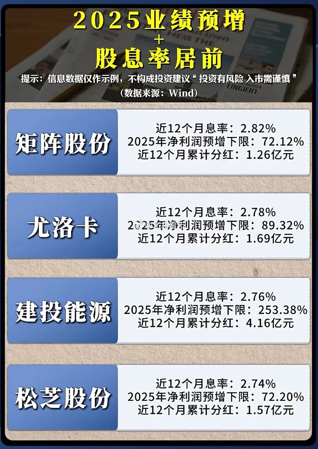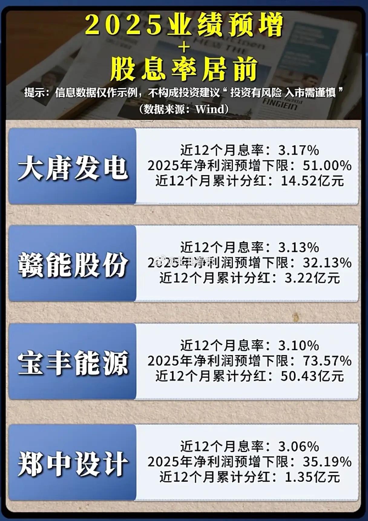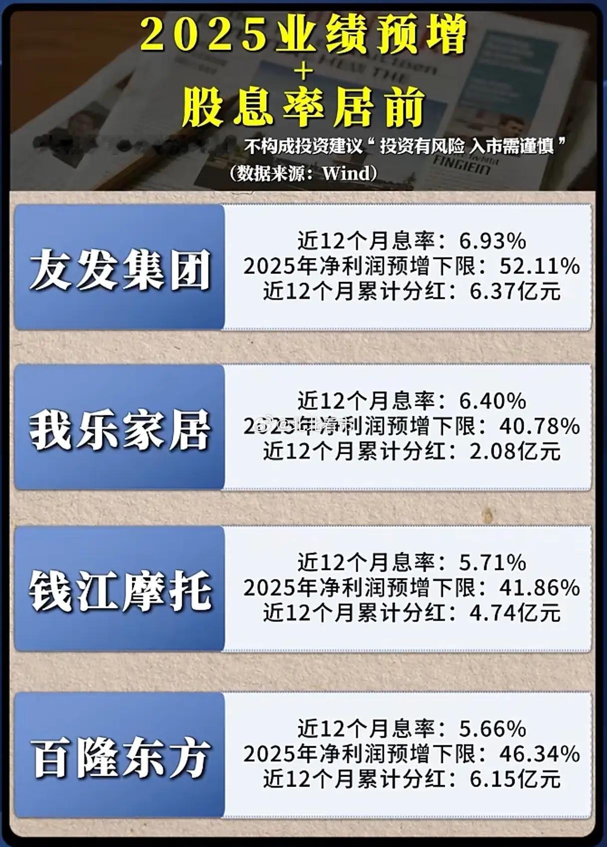 股息+业绩双增,2025年A股真的能“躺赢”吗?当股息率与业绩预增形成共振,A股市场正悄然掀起一场“价值回归”的浪潮。从友发集团近12个月6.93%的股息率,到广东明珠2908.49%的惊人业绩预增下限,这些数据不仅是数字的狂欢,更是行业复苏与资本信心的双重注脚。在传统行业中,友发集团、我乐家居等企业凭借高股息率成为市场焦点。友发集团以6.93%的股息率和52.11%的业绩预增下限,展现了钢铁行业在供给侧改革后的盈利韧性;我乐家居则在地产链复苏预期下,以40.78%的业绩增速和6.40%的股息率,印证了家居行业的复苏动能。这些企业的高分红不仅是对股东的回馈,更是行业格局优化、现金流改善的直接体现。新兴赛道同样亮点纷呈。普菜柯、吉比特等公司在业绩预增与股息回报之间找到了平衡。普菜柯89.64%的业绩预增下限,反映了其在细分领域的技术突破;吉比特79.00%的增速则受益于游戏行业的产品迭代与出海扩张。而一心堂、芭田股份等企业超100%的业绩预增,更是医药、农业等刚需行业穿越周期的有力证明。值得警惕的是,部分企业的业绩预增幅度已远超市场预期,如广东明珠2908.49%的预增下限,背后可能存在基数效应、非经常性损益等因素。投资者需理性区分“业绩爆发”与“业绩修复”,避免陷入短期炒作的陷阱。同时,高股息率也需结合企业的盈利可持续性、负债水平等维度综合判断,避免被“纸面富贵”误导。站在2025年的起点,我们看到的不仅是数据的亮眼,更是中国经济转型升级的缩影。从传统行业的价值重估到新兴产业的技术突破,从资本回报到产业升级,A股市场正以更成熟的姿态拥抱价值投资。但在乐观预期中,我们更需保持清醒:高增长意味着高预期,高股息也需匹配高质量。唯有在理性中前行,才能在这场价值盛宴中真正收获属于自己的果实。