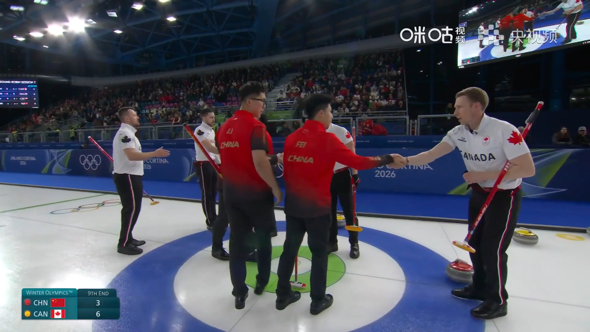 米兰冬奥会冰壶男子循环赛,🇨🇳中国 3-6 加拿大🇨🇦,前5局双方战至2比2平,加拿大第6局和第8局共得4分,第9局中国队扳回1分。中国队见翻盘无望,主动握手认负,比赛提前结束。最终3比6不敌加拿大。