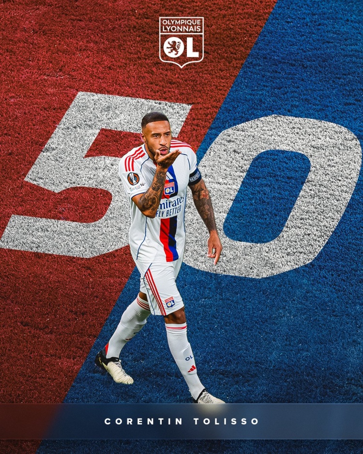这是托利索在正式比赛中为里昂攻入的第50粒进球,里昂官方社媒晒出海报,祝贺他达成这一里程碑。