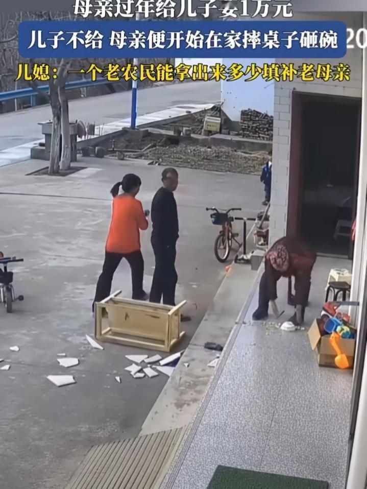看得心酸!陕西一处农家院里,一段监控,看得人心里发沉。 儿子儿媳千里回乡,陪老母亲吃顿年饭,本是团圆的光景。饭还没凉,老母亲忽然开口,张口就要一万块钱。 儿子愣在原地,只如实回了一句:眼下,拿不出。 就这一句话,掀了天。 老人猛地抬手,饭桌应声翻倒,碗筷碎了一地。 能砸的,尽数砸了,嘴里骂声不断,火气大得吓人。 一旁的儿媳手足无措,只低声叹一句: 一个普通农民,能有多少余力,年年这样填补。 场面难堪,又真实得扎心。网友议论纷纷,有人说老人性子太烈,做事不留余地。更多人不解,一万块不是小数,若真有急用,大可明说。 若是病痛,子女不会不管;若是吃喝,也用不上这般吵闹。偏偏用最伤人的法子,向最亲的人发难。 我向来觉得,人间最凉的事,莫过于亲情败给钱财。 老人以为,给钱才算孝顺;子女以为,尽力便是心安。 两边都觉得委屈,最后闹得相看两厌。 儿媳那句无奈的念叨,道尽了普通家庭的难处。 不是不养,不是不孝,是能力有限,量力而行。 钱能买来吃食,买来物件,买不来血脉里的温情。 一掀桌,碎的不是碗筷,是多年的母子情分。 一顿团圆饭,成了一场闹剧,实在可悲。 很多网友看完都忍不住叹气,这世上最蠢的事,就是拿着钱去考验最亲的人。老母亲守着一亩三分地,儿子儿媳在外打拼也是挣的辛苦钱,谁的日子都不算轻松。过年回家图的是热热闹闹、一家人和和气气,不是一开口就要大笔钱,达不到心意就撒泼闹事。 老人要是真有难处,好好跟子女商量,没人会真的不管不顾,可偏偏选了最伤感情的做法,把好好的团圆搅成了一锅粥。亲情从来不是靠索取来维持的,也不是用金额来衡量的,老人平平安安,子女尽心尽力,遇事好好沟通,比什么都值钱。 各位读者你们怎么看?欢迎在评论区讨论。