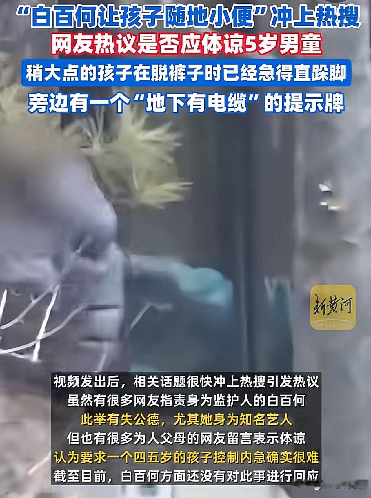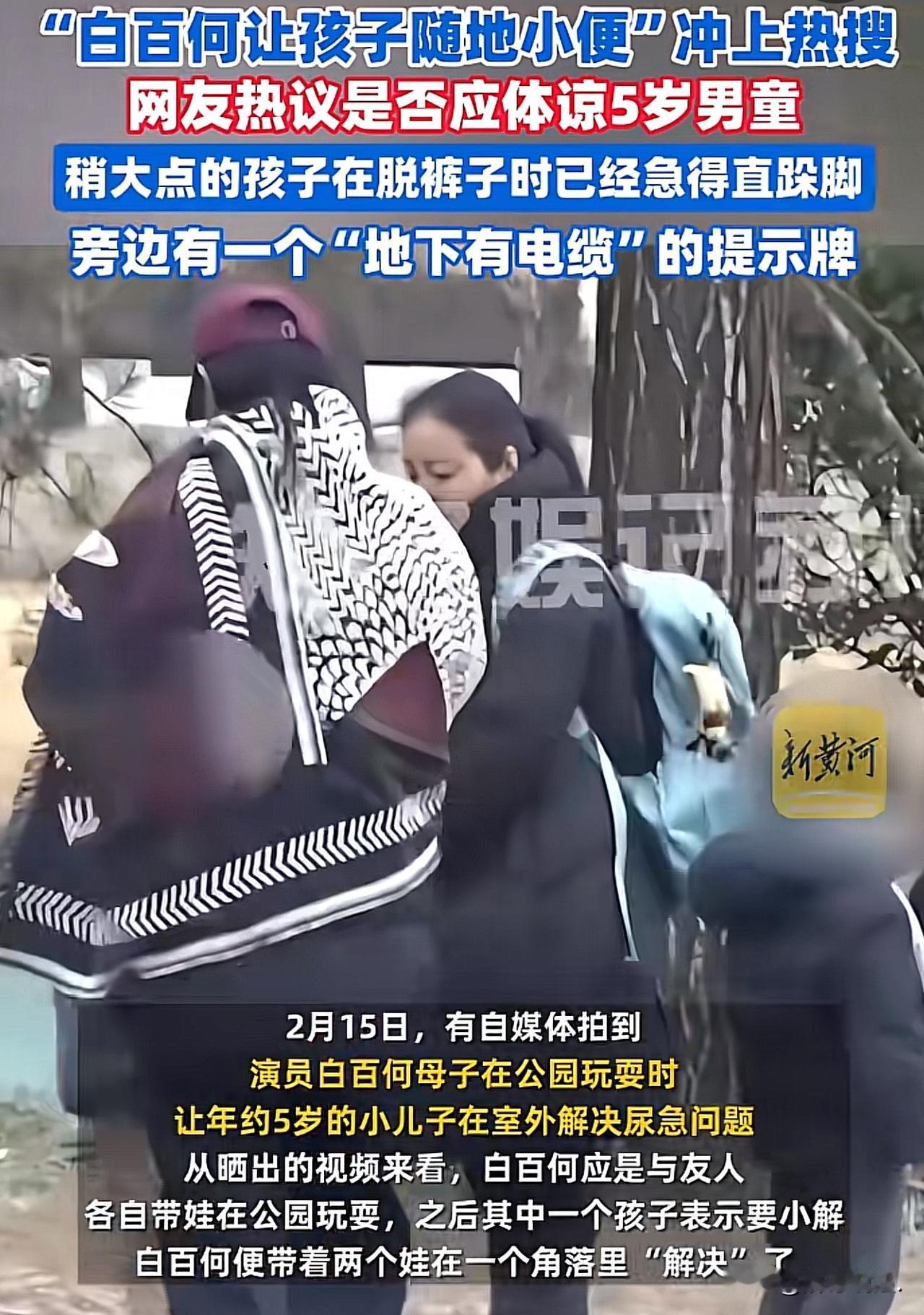 “没必要上纲下线吧?”北京,知名女演员带着两个孩子去公园玩耍,期间,两个孩子玩上头了,一泼尿憋着,导致尿急了。其中一个孩子瘪得直跺脚,女演员见状,赶紧让孩子就地解决!没想到,这段视频被有心之人发布到了网上。网友开始吐槽:太没素质了! 2月15日,娱乐圈又一件小事冲上了热搜榜首,不是新剧,不是绯闻,而是演员白百何,被拍到带着孩子在公园角落里随地小便。 这件事一曝光,立刻在网上炸开了锅,有人骂,有人心疼,吵得不可开交。 事情的经过其实很简单。当天,白百何和朋友一起,各自带着孩子在公园里休闲玩耍,本来是很平常的亲子时光,结果中途出了点小意外,孩子突然尿急了。 视频里能看得很清楚,其中那个大约5岁的小男孩,已经急得不行,脱裤子的时候都在直跺脚,明显是憋不住了,再晚一步就要尿裤子了。 情急之下,白百何没有带着孩子去找公共厕所,而是就近找了一个相对隐蔽的角落,让两个孩子直接在原地解决了内急。 眼尖的网友还发现,孩子小便的位置旁边,就立着一块醒目的“地下有电缆”提示牌,这一幕也成了大家争议的焦点之一。 很快,“白百何让孩子随地小便”的话题就冲上了热搜,评论区直接分成了两大派,谁也说服不了谁。 一部分网友态度很坚决,认为白百何这件事做得确实不对。 作为公众人物,本来就比普通人更受关注,理应起到模范带头作用,在公共场合随地小便,不管怎么说都是不讲公德、不讲卫生的行为,既破坏了公园的环境,也给其他人带来不好的观感,更何况旁边还有电缆提示牌,不管是从安全还是文明角度,都不太合适。 但另一波网友,尤其是当过爸爸、妈妈的人,却特别能理解白百何的无奈。 大家都说,没带过四五岁孩子的人,根本不懂这种紧急情况。 小孩子的膀胱发育还不完善,憋尿能力很差,说要尿尿就是分分钟的事,根本等不及你慢慢找厕所、排队、赶路。 视频里孩子都急得直跺脚了,当妈的第一反应肯定是先不让孩子受罪,这是本能反应。 大家也表示,带娃出门在外,遇到孩子突然内急简直是家常便饭,很多家长都经历过四处找厕所、慌手慌脚的时刻,只不过普通人做这件事没人拍,而白百何是明星,一举一动都被放在放大镜下看而已。 据公开信息显示,今年41岁的白百何,家里有两个孩子,大儿子元宝都已经18岁了,小儿子才5岁左右,算是老来得子,平时对孩子疼爱有加也很正常。这次的事情,说到底就是一个妈妈在情急之下的选择,谈不上有多坏,却因为身份被无限放大了。 截至目前,白百何和她的工作室,都还没有针对这件事做出任何回应。其实这件事本身不大,却戳中了很多家长的痛点!公共文明和孩子应急需求,到底该怎么平衡? 我们可以讲究公德,可以要求公众人物做好榜样,但也不必对一个情急之下照顾孩子的母亲太过苛责。 谁都有手忙脚乱的时候,一泡尿而已,没必要上纲上线,更没必要揪着一点小事不放。 这件事也给所有家长提了个醒,带低龄孩子出门,尽量提前做好准备,但真遇到突发情况,也希望大家能多一分理解和包容。 而对于明星来说,更要注意自己的言行,毕竟关注度高,更要在文明细节上多加留意,避免再因为这类小事引发争议。 说到底,生活本就不完美,养孩子更是一地鸡毛,多一点换位思考,很多争吵其实都没必要。