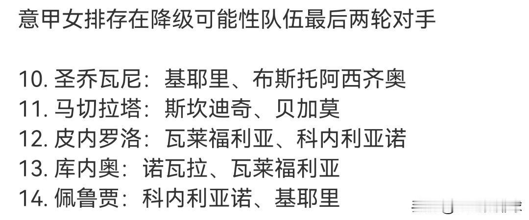 朱婷临危受命!关键分方显实力。 第四局面对科内22:24佩鲁贾,眼瞅着要拖入第五局。朱婷替换西拉上场,2扣2中,一个造打手出界,一个小斜线,为本方挽救2个赛点。 昨晚,一看对阵佩鲁贾,没想到科内几乎全替补首发。所以在直播间就看了2局,就跟着转看庄宇珊的比赛了。 又看了一局圣瓦乔尼VS基耶里,觉得圣爆冷击败基耶里的可能性一点没有。对方是多点开花,且一开局直接6:1拉开差距,关机睡觉 。 果不其然,一觉醒来,圣瓦乔尼0:3基耶里。但是小庄仍然拿到10分(22扣10中,2被拦)。表现不错! 目前佩鲁贾铁定降级,另外一支球队谁降级,悬念要留到意甲常规赛最后一轮。 意甲太会整活了! 最后一轮: 圣瓦乔尼vs布斯托 马切拉塔VS贝加莫 蒙维索VS科内 库内奥VS瓦莱福利亚