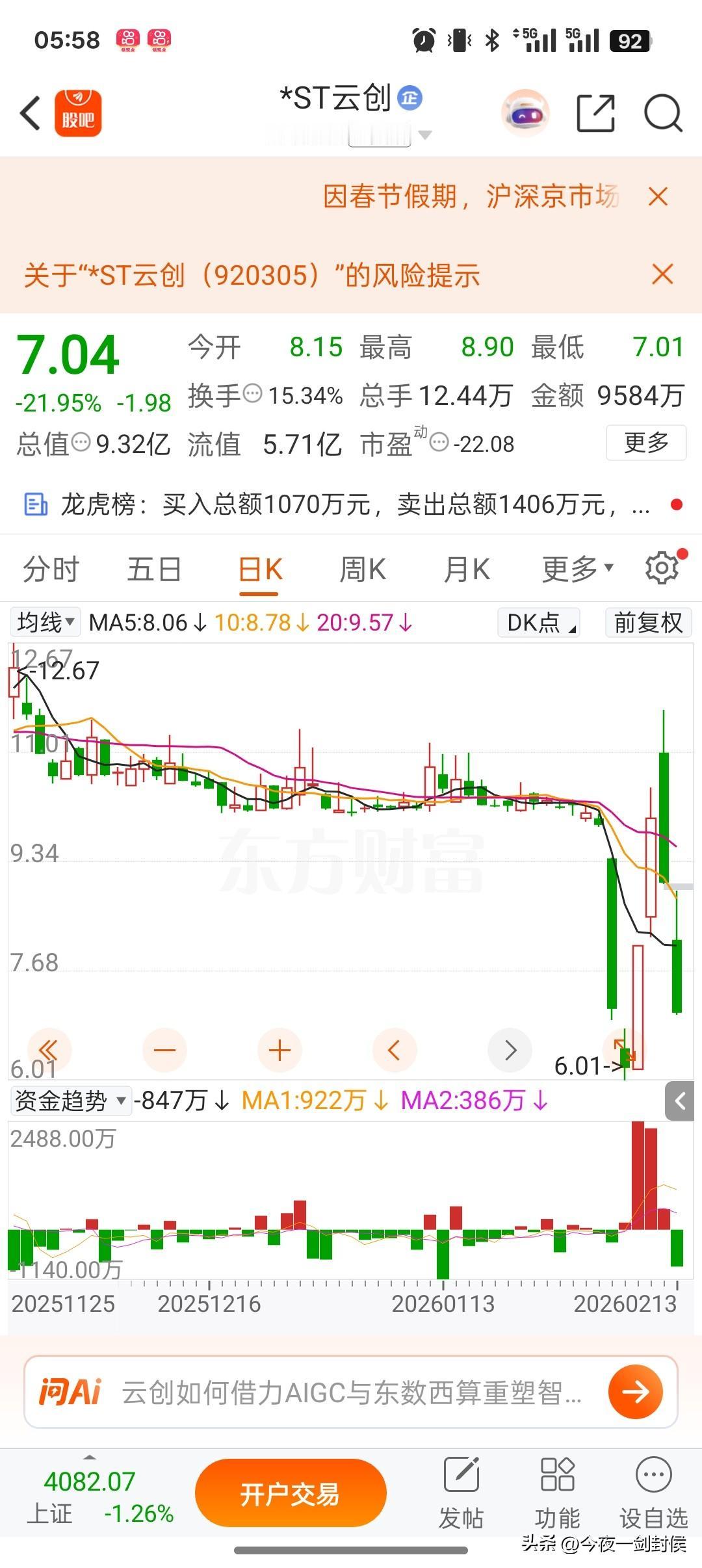 st立方,让我有些惊悚,居然真的停牌退市了,退市整理期一般半个月,再次开盘股价会断崖式暴跌。 我参与过St广道,三天翻了一倍,这叫末日轮高潮,所以,1月29日,我又参与了st立方,买的当天就停牌了,停了三天,2月4日出来,当天涨停了,可我开盘冲高跑早了。 我还换成了自以为更确定和安全的st云创,结果st云创下午涨停打开回落了。 2月4日晚上,st云创宣布停牌5天。 我只好账户里加了点钱。 2月5日,st立方涨停,我又进去了。 st立方晚上再次停牌,还是三天。 2月11日复牌,开盘冲高我又跑了,这种股拿着害怕。 当天冲板就差一分钱! 我知道坏了,涨停板上压着两千多万的卖单,这个不会有资金接得下的,之前龙虎榜上都是三四百万的资金在接力。 我知道St立方不会涨停了。 果然当天见顶大幅回落,之后连续两天跌停,春节假期里忽然宣布退市了。 ST云创停牌5天,比ST立方停牌早一天,复牌晚一天,2月12日出来当天开盘资金顶的很高,我又跑了。 当天ST云创被ST立方带动大幅度回落,大跌两天,图形变得很难看,我就没再参与了。