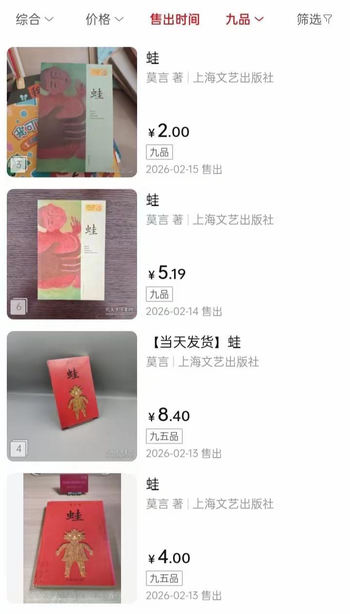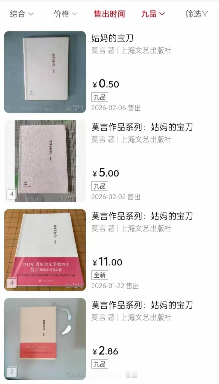 孔网二手书成交价曝光!莫言作品惊现0.01元“白送价”,浩然《金光大道》却卖到240元!这差距到底打了谁的脸? 过年扫房掏出一堆旧书,顺手挂到孔夫子二手书网上一看,嘿,这莫言和浩然的书价,简直一个天上一个地下。 拿俩人最能打的几部作品比划比划。浩然这边,写农业合作化的老书《艳阳天》,六十年头一版一印的版本,品相稍微过得去,成交价直接干到好几百。那本《金光大道》,争议大吧?可七十年代的老版本,九品以上能卖出240块的高价。就连他八十年代末写的《苍生》,也能稳当当卖个几十块。 再看莫言,诺奖加持,光环够亮吧?《丰乳肥臀》算是他史诗级的代表作吧?《蛙》可是拿了茅盾文学奖的。可到二手市场上,现实就有点打脸了。那本被专家吹上天的短篇小说集《姑妈的宝刀》,最新的成交价,9品以上接近全新的书,竟然挂着0.01元,加上5块钱运费就当破烂甩了。还有一本0.1元成交的,基本等于白送。山东潍坊那边书友刚拍的,三本打包也就卖个白菜价。 这不比不知道,一比吓一跳。专家评委看重的大奖,到了老百姓掏钱的节骨眼上,真不如一本老故事的号召力。浩然的书,老头老太太们是真愿意花大价钱买回去翻看,那书里的人和事儿,扎在土里,看得见摸得着。莫言的书,排场大,噱头足,可真要自己掏钱往家请的时候,大家伙儿的钱包就捂紧了。 说白了,书这玩意儿,能不能传下去,能不能值钱,不看你拿了多少奖,也不看作协那帮人怎么吹。就看你写的人,是不是中国人心里惦记的那点事儿。你写的东西能不能从书架上活到人心里,时间这关最难过。 二手书市场就是个照妖镜,买家拿钱包投的票,比啥奖状都好使。大家心里都有杆秤,你愿意花二百块买本老书搁书架上传家,还是花两块钱买本诺奖得主翻两页就扔?评论区里唠唠。浩然文学 闲鱼二手书 人民文学热销 二手书籍 浩然文集 孔夫子旧书市 孔夫子旧书摊