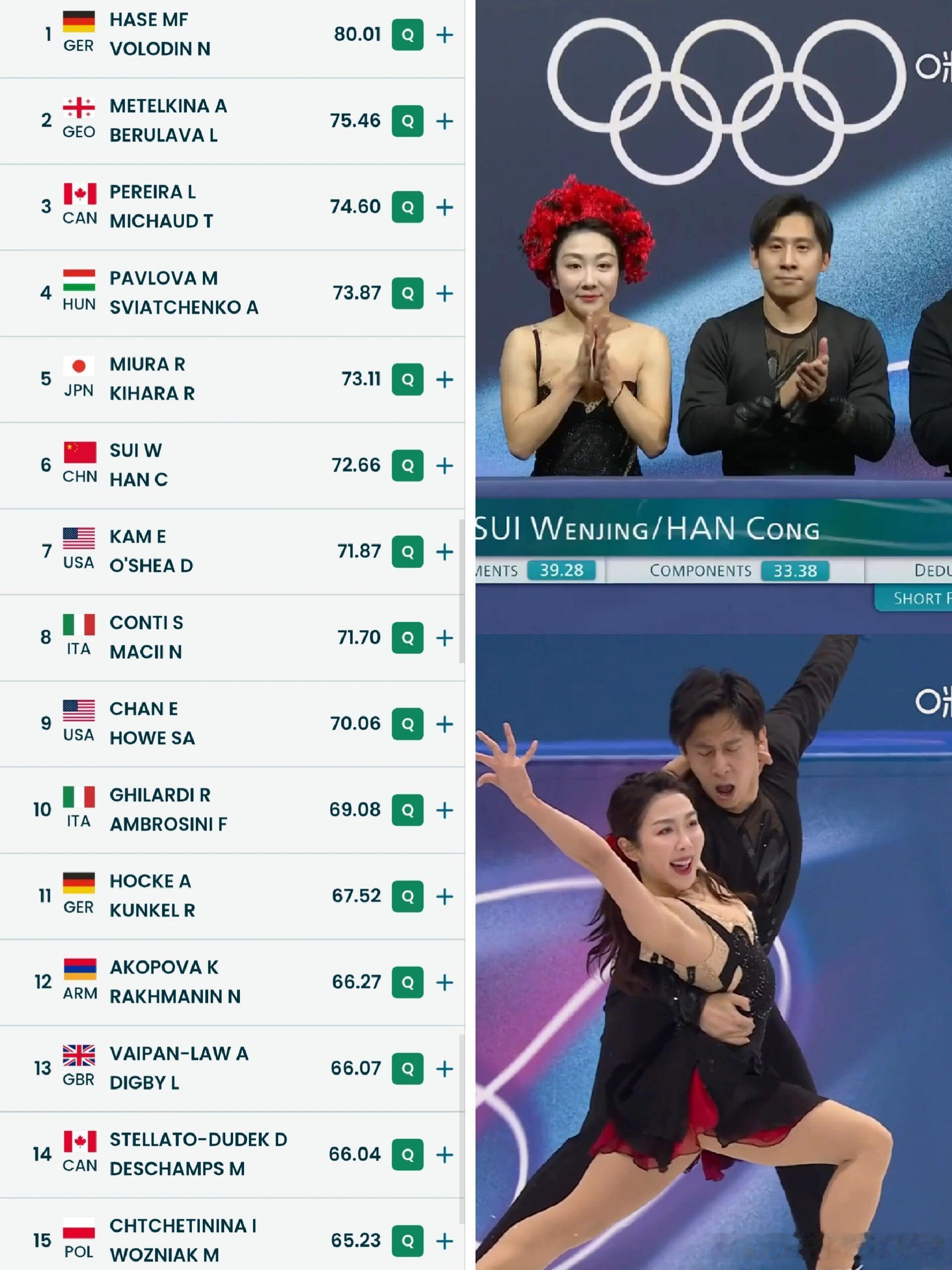 隋文静韩聪双人滑短节目恭喜隋文静韩聪短节目72.66分排名第6晋级自由!老将依旧
