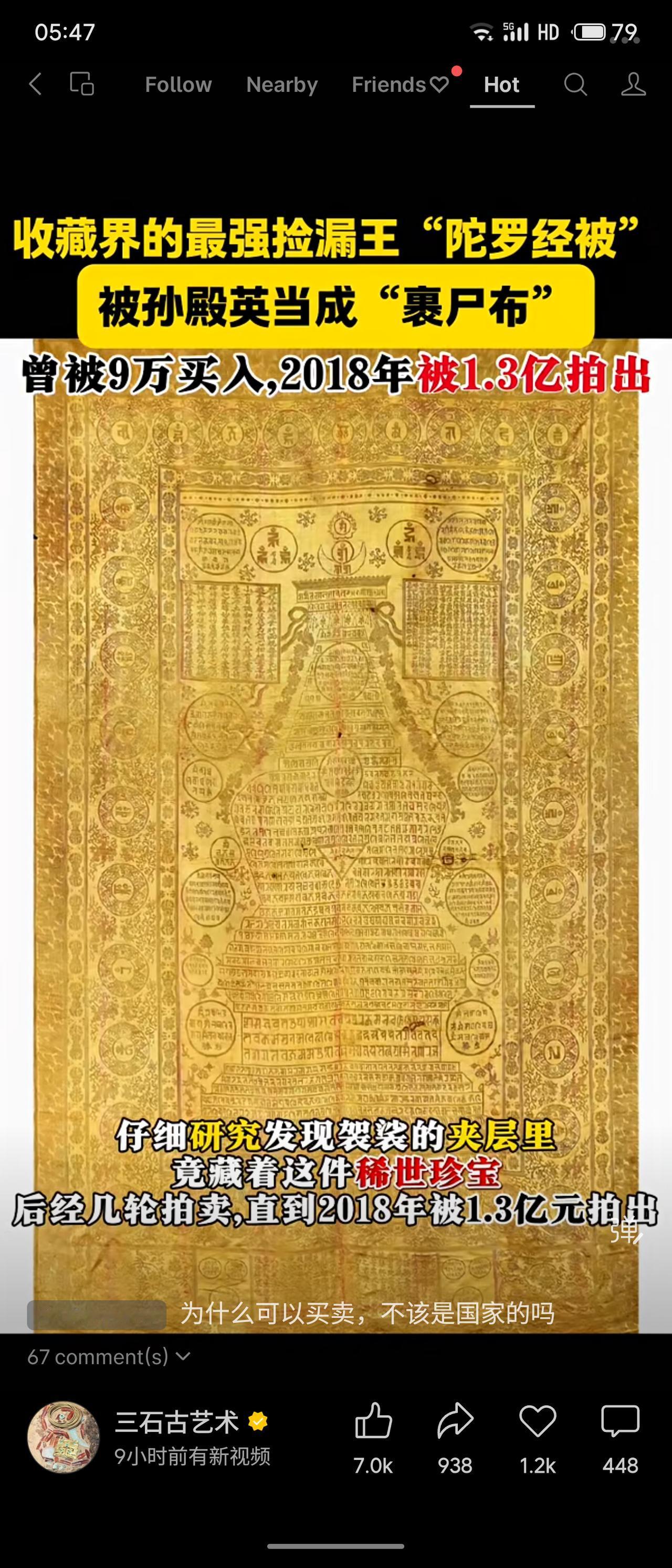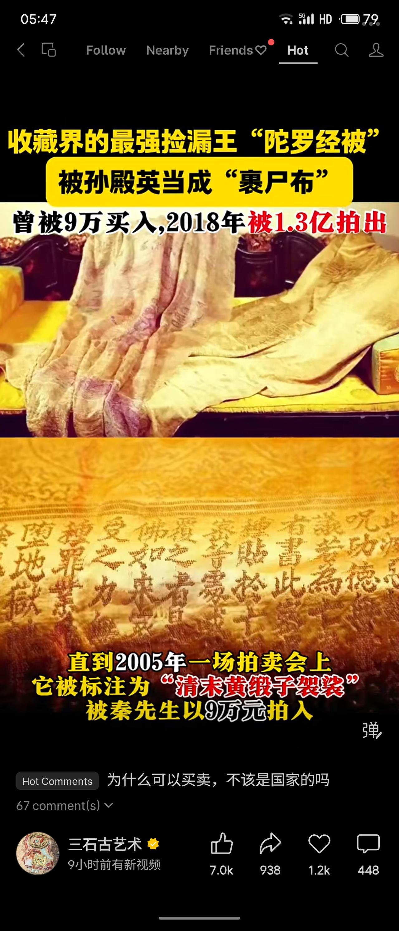 乾隆陀罗经被1928年孙殿英盗陵时被当作裹尸布遗落民间,2005年秦先生9万元拍得“袈裟”,发现夹层珍宝,2018年拍出1.3亿天价,网友质疑文物归属。
