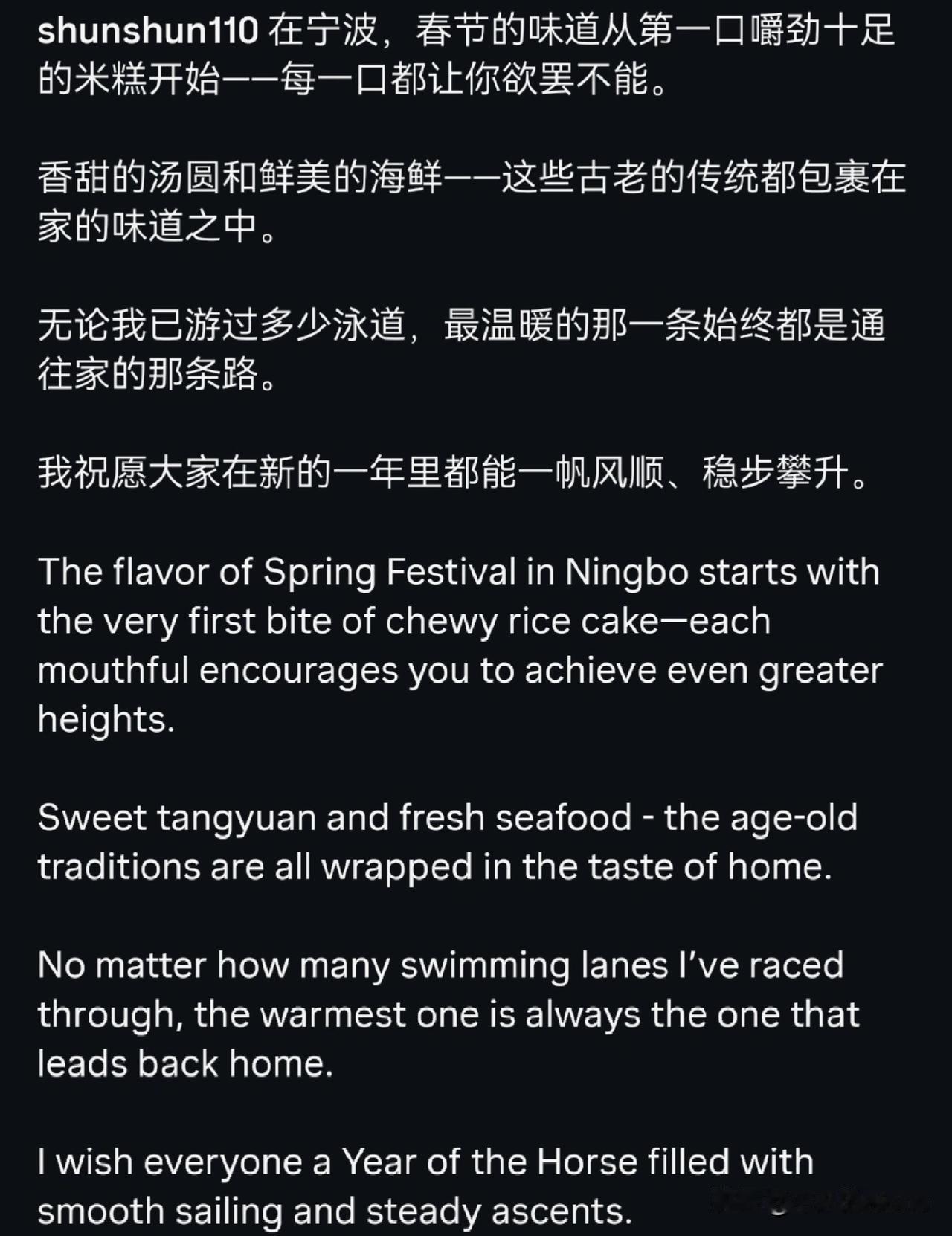 2月16日,汪顺发文说:“在宁波,春节的味道从第一口嚼劲十足的米糕开始,每一口都让你欲罢不能。” 汪顺发了5张照片,3张单人照,2张美食照。 汪顺身穿黑色羽绒服,下身搭配白色休闲裤与运动鞋,整个人看上去非常帅气。 汪顺是浙江宁波人,不知道他会不会参加洛杉矶奥运会,希望他未来一切顺利。