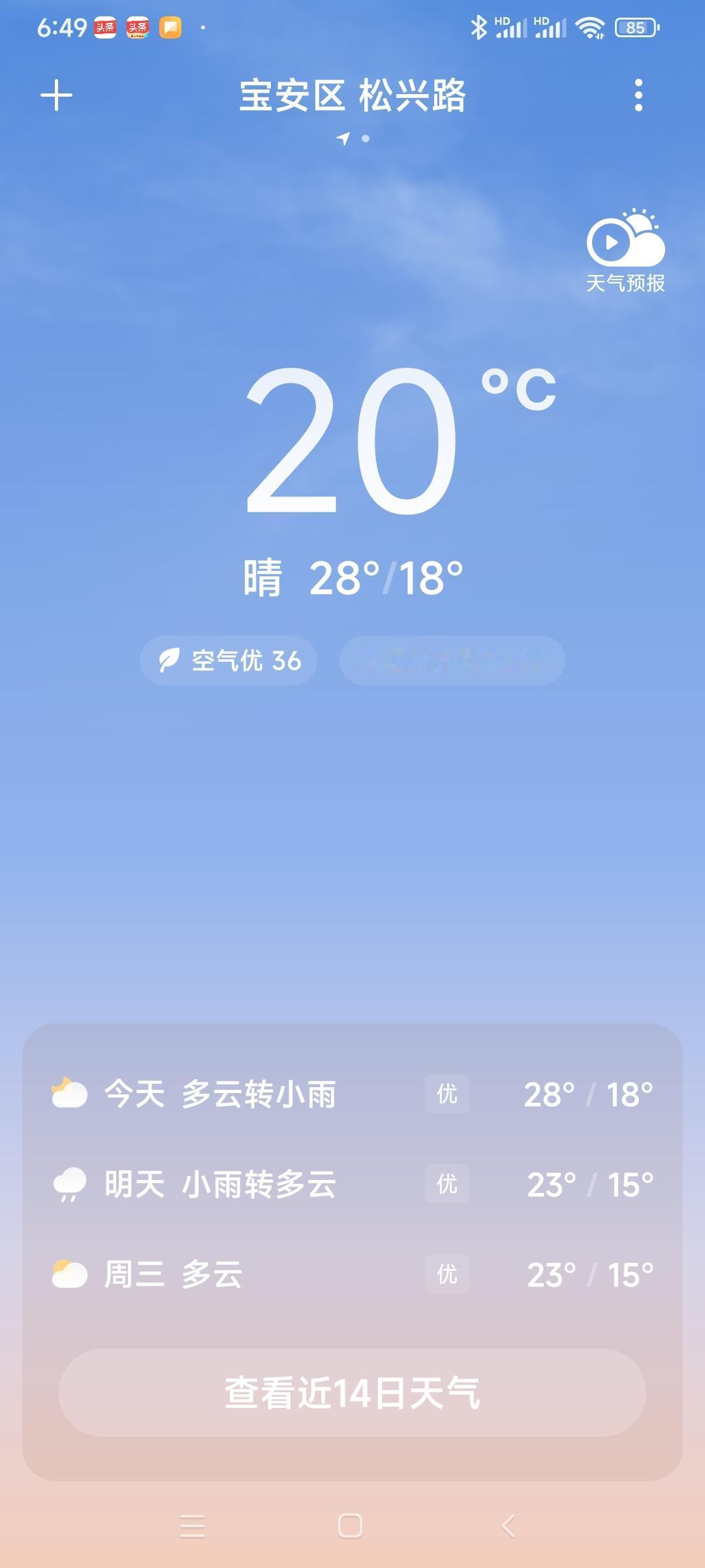 我的今日状态:😁轻松愉快 我这里的天气:🌤️多云深圳今日多云转小雨,气温18
