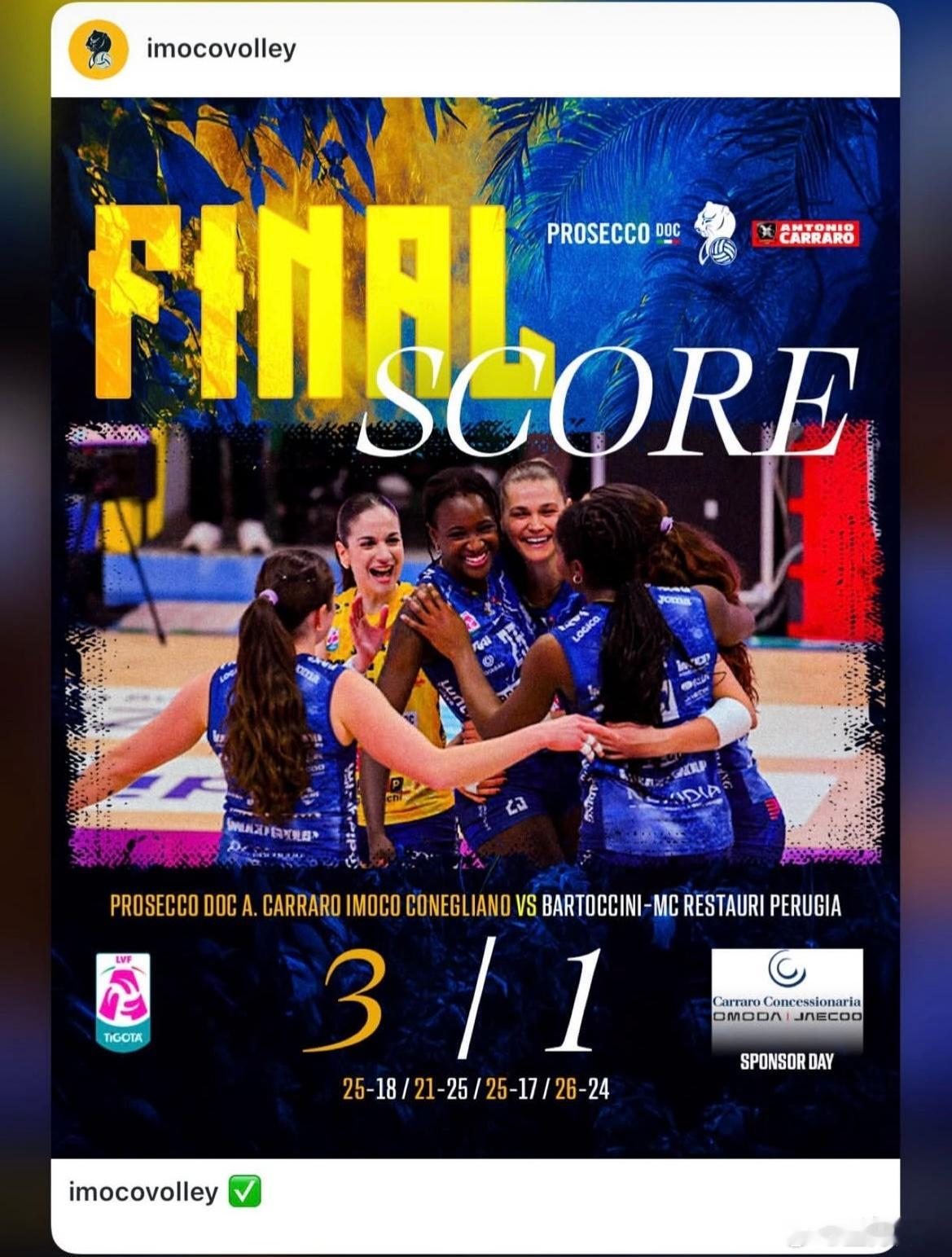 朱婷 意甲女排联赛25轮,科内利亚诺3-1佩鲁贾,佩鲁贾女排锁定一个降级名额!