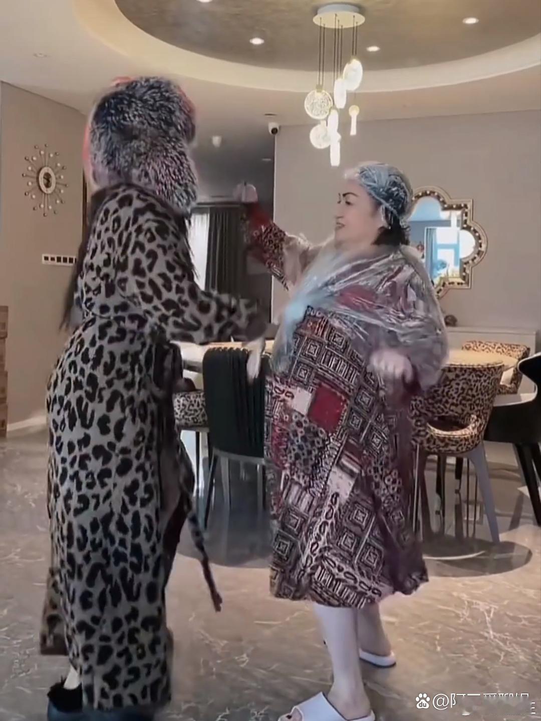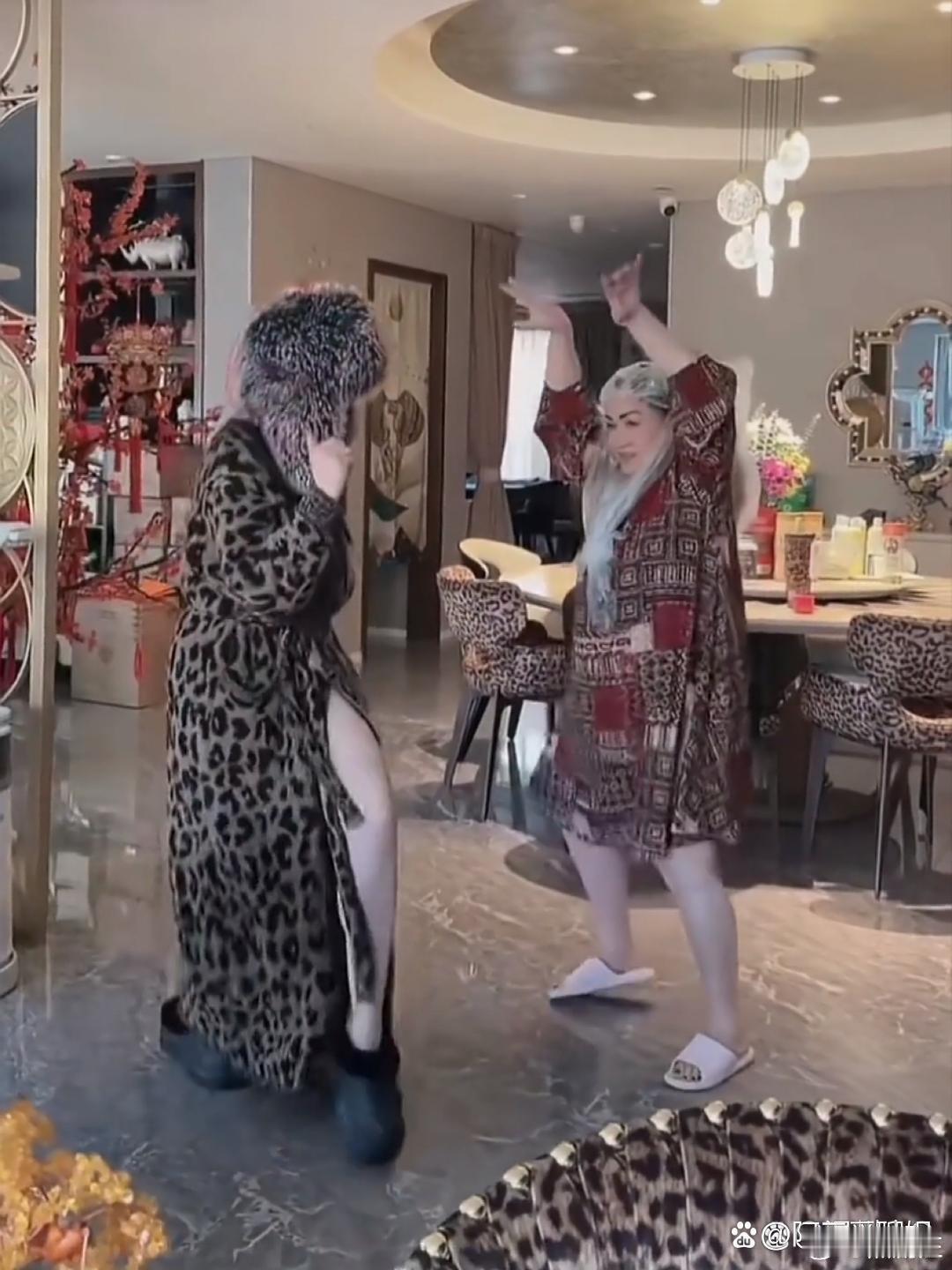 钟丽缇和母亲在家欢乐共舞,钟丽缇穿得是真夸张,豹纹长款大衣配皮草帽,身材丰腴,性
