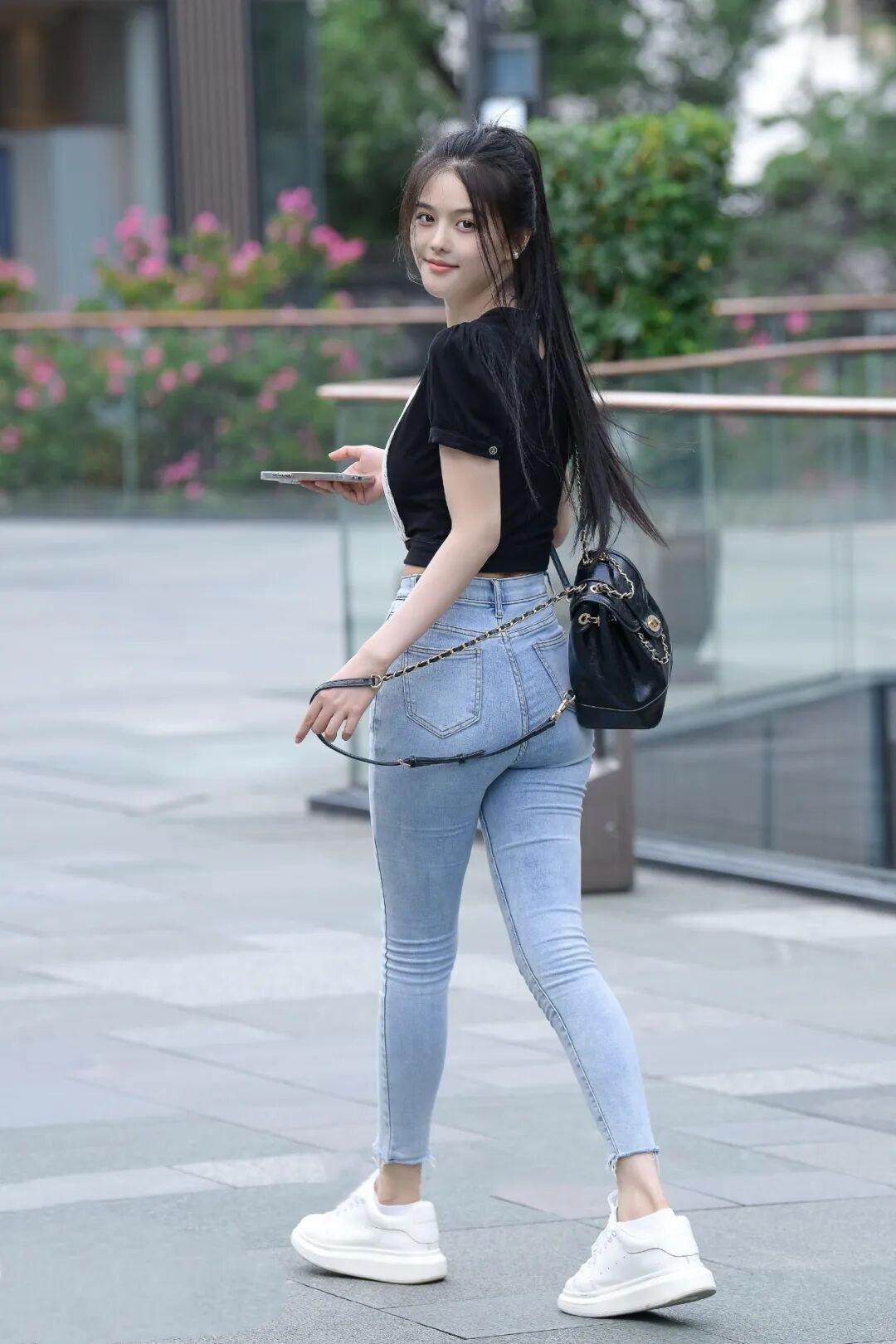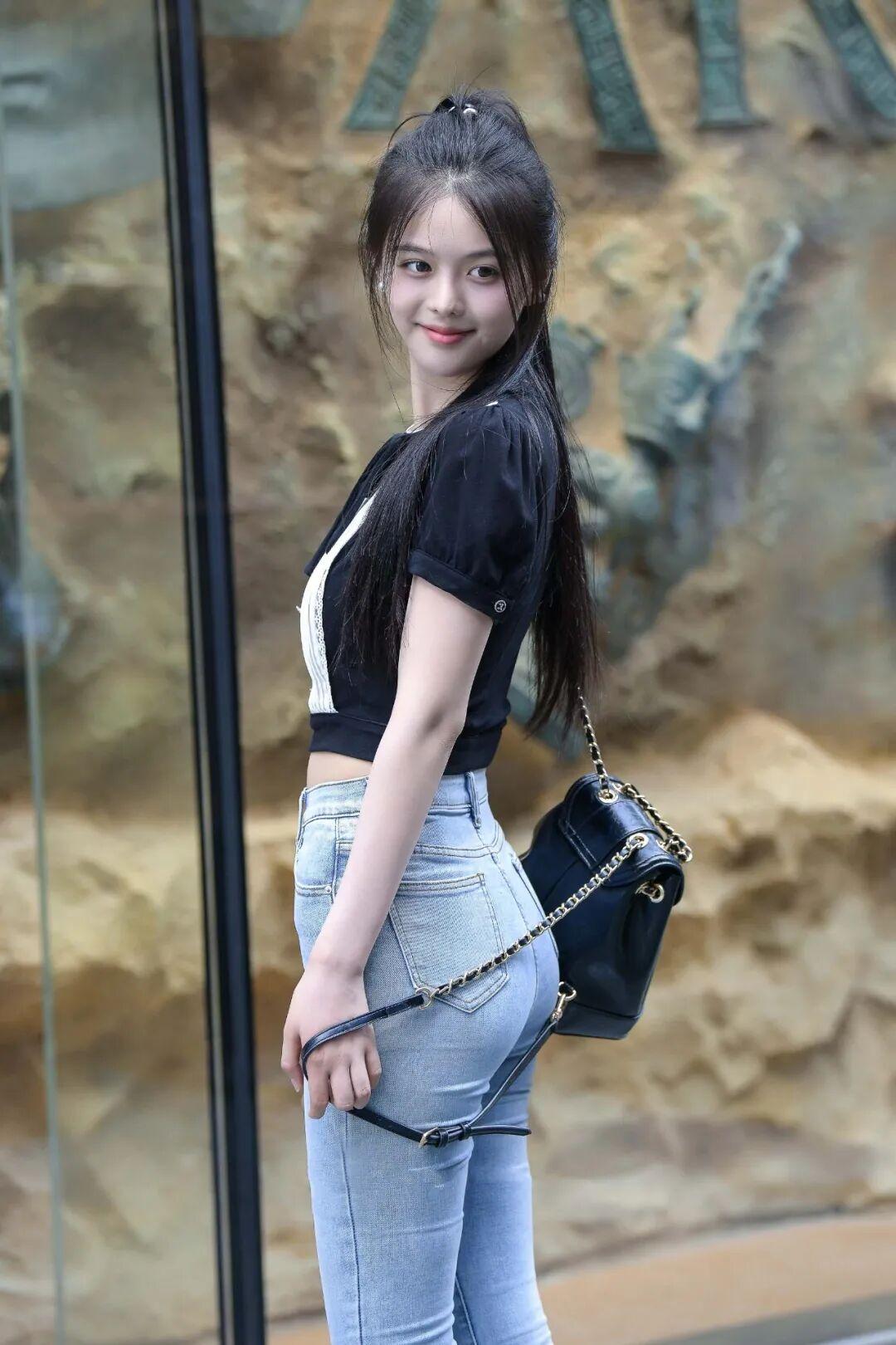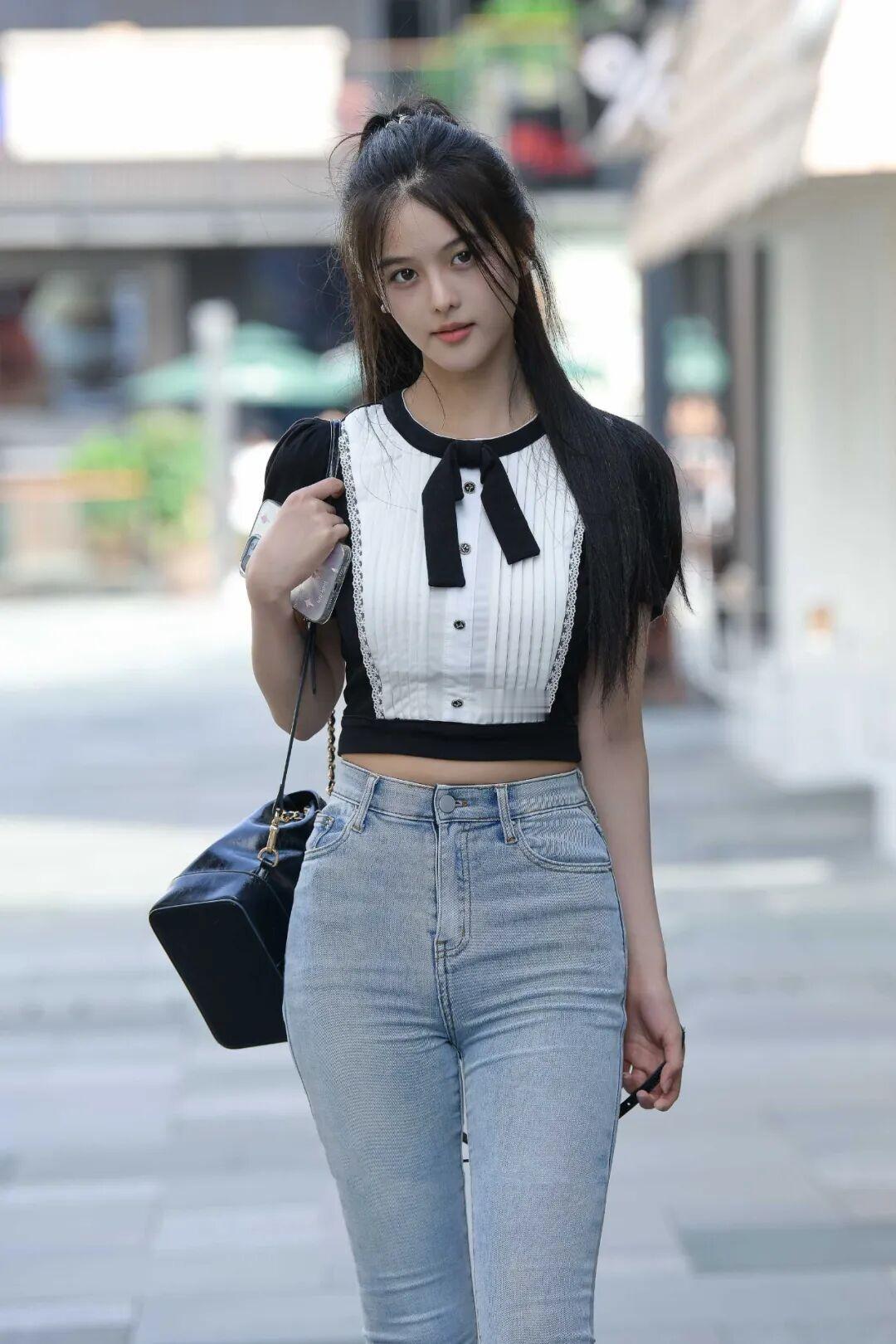 甜美少女风穿搭,黑白拼接上衣搭配牛仔裤,清新自然!