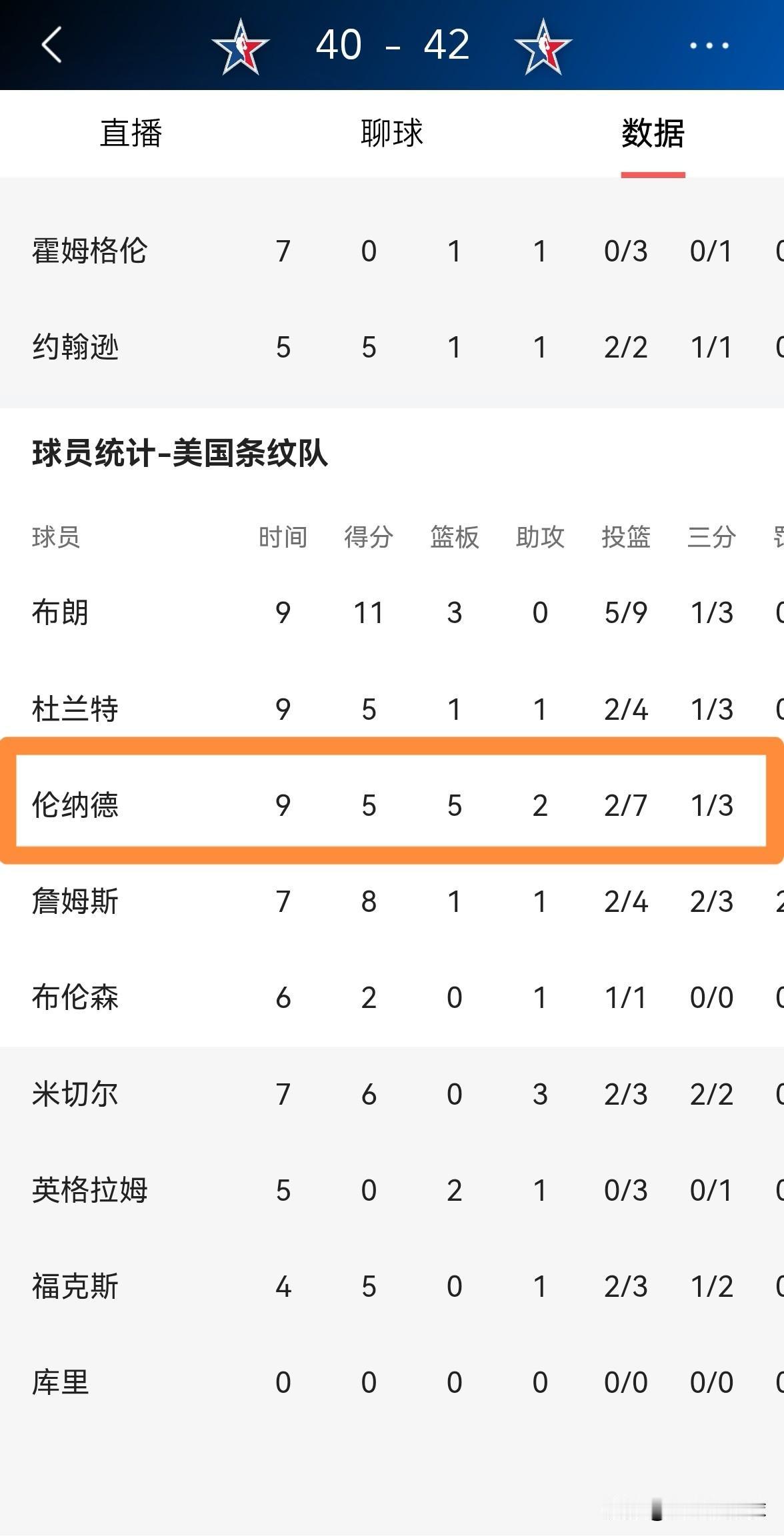 快船巨星伦纳德真是太失常了!在今天美国条纹队以42:40险胜美国星队的比赛中,伦纳德的手感非常一般,他在首发出战的9分钟里,投篮7中2,其中三分球3中1非常低效的得到5分。 坦白说,以伦纳德的能力来看,他在本场比赛中的表现简直是大失水准,何况本届全明星是在快船的主场进行。