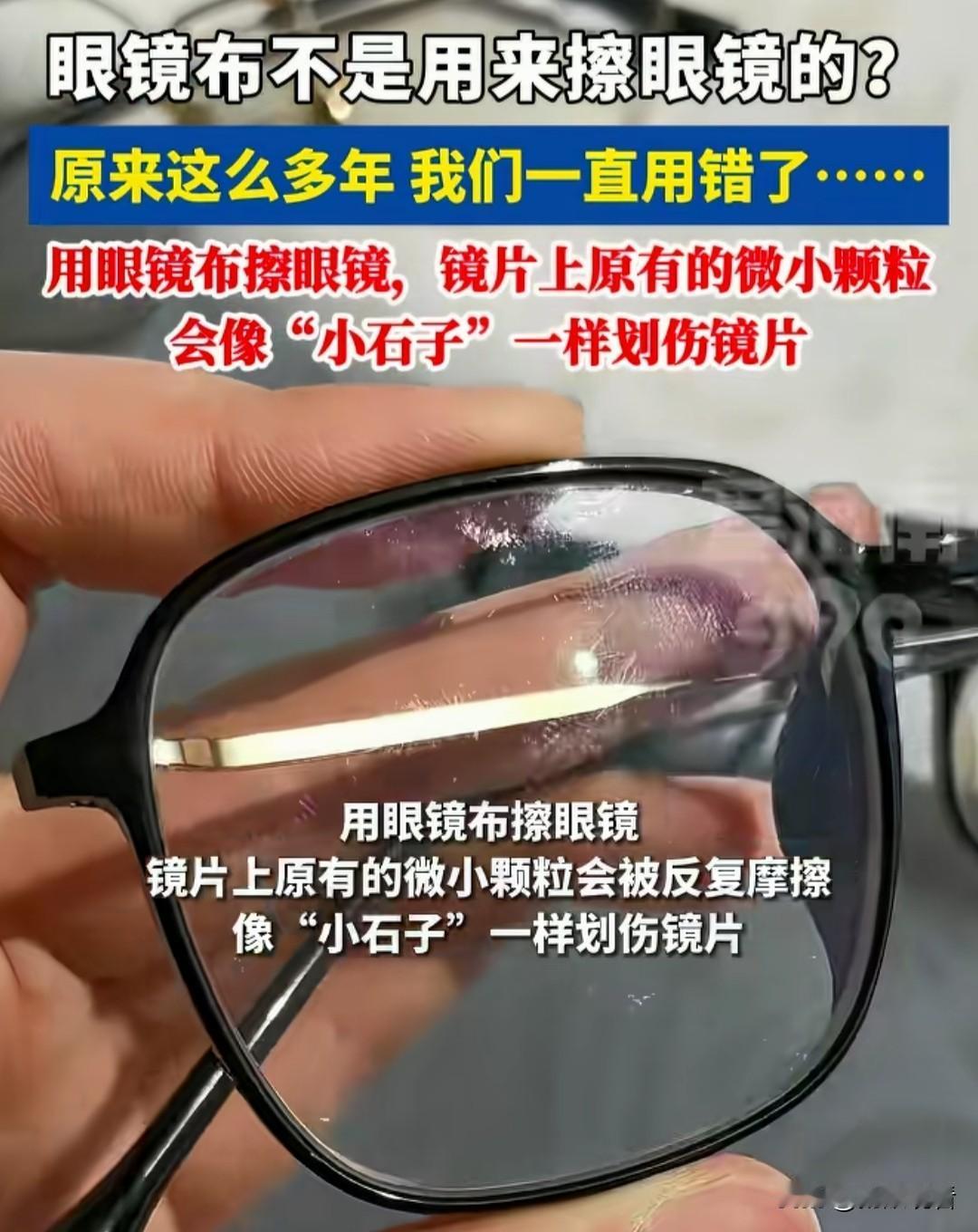 才知道眼镜布不是擦眼镜的😱 我用了十几年眼镜布 居然一直用错了!! 原来眼镜布的真正作用是: ✅ 包眼镜防刮花 ✅ 洗完吸干水分 ❌ 不是让你干擦镜片!! 镜片上有灰尘+沙子 干擦=直接给镜片镀膜磨花 越擦越糊 越擦越花😭 ✅ 正确擦眼镜方法 1. 流动清水冲掉灰尘 2. 挤一点点洗洁精轻揉 3. 清水冲干净 4. 眼镜布/纸巾按压吸干 别来回擦!别来回擦! 我家那副旧眼镜 原来全是我擦出来的划痕…