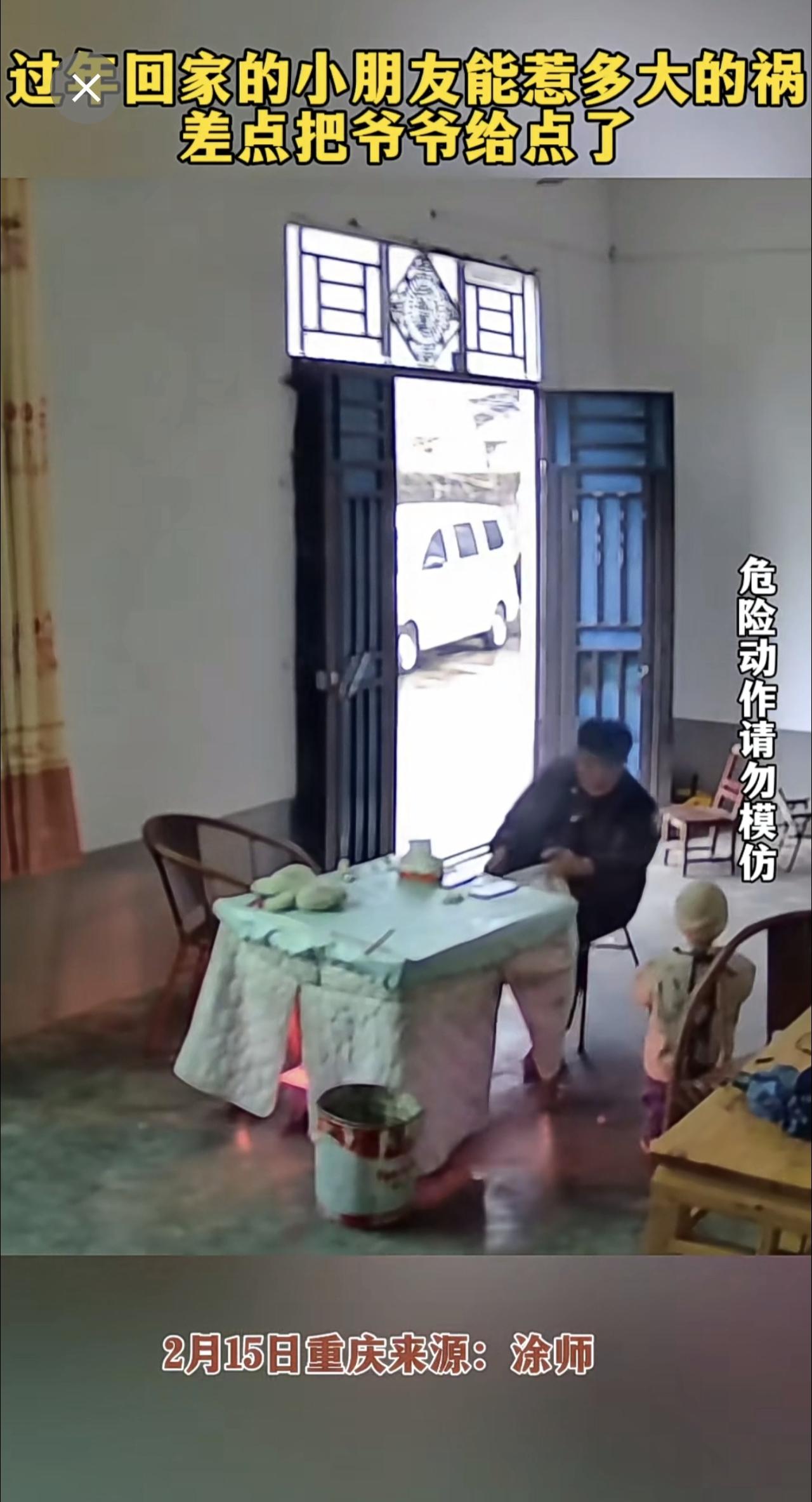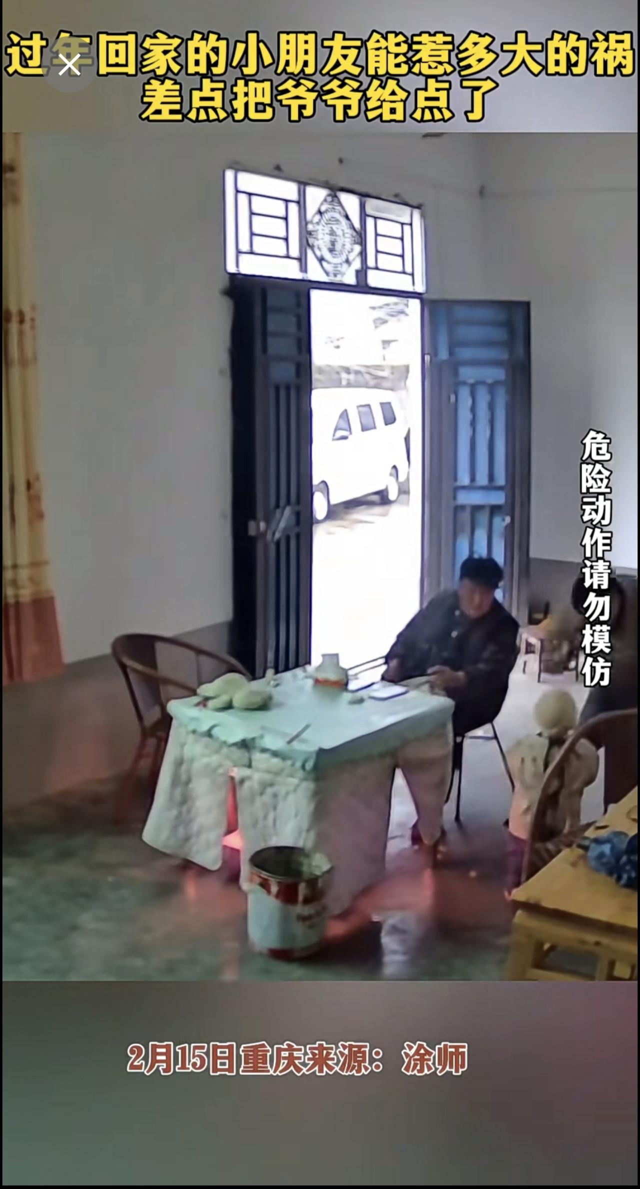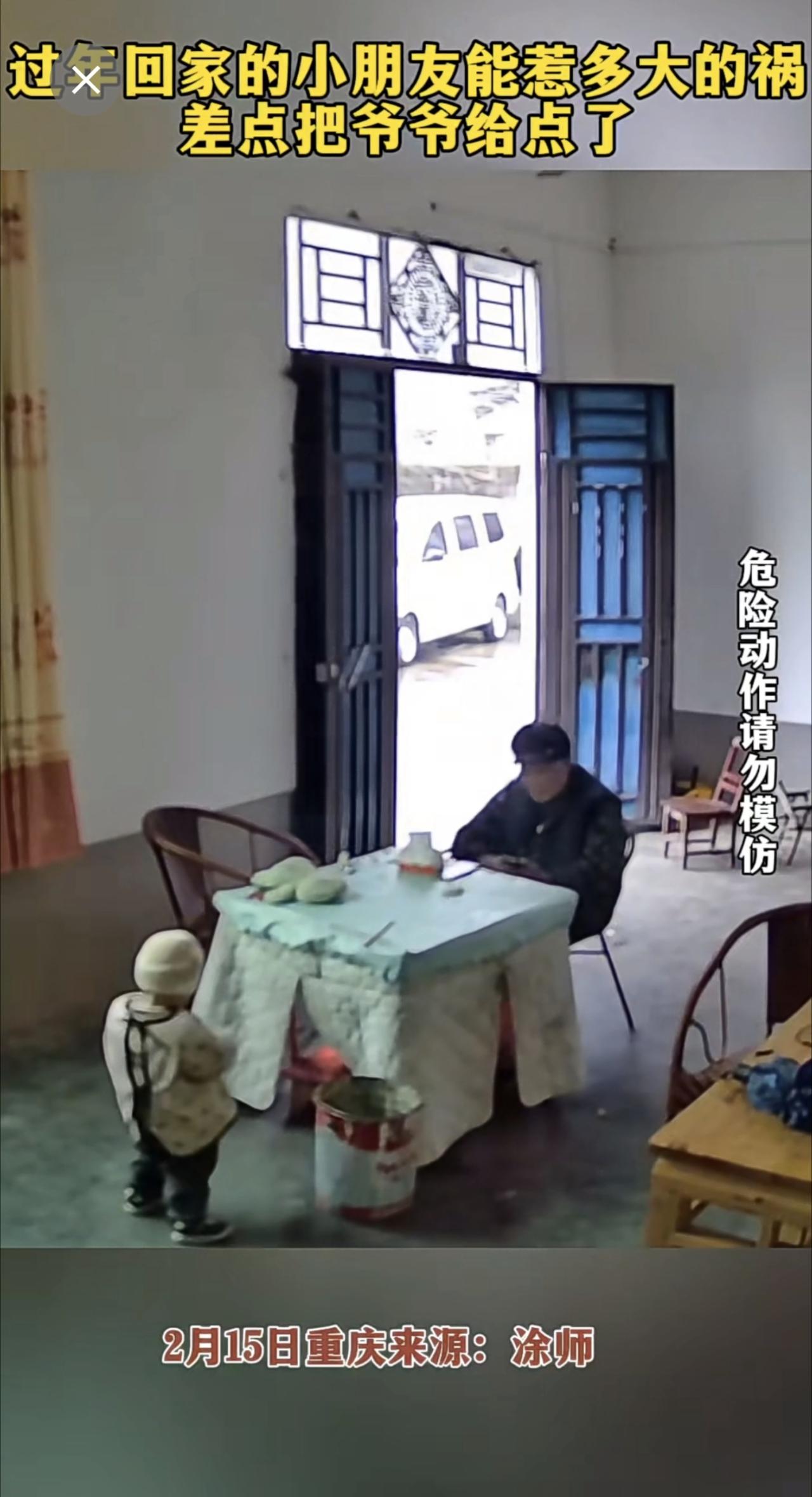 过年回家的小朋友能惹多大的祸,差点把爷爷给点了。