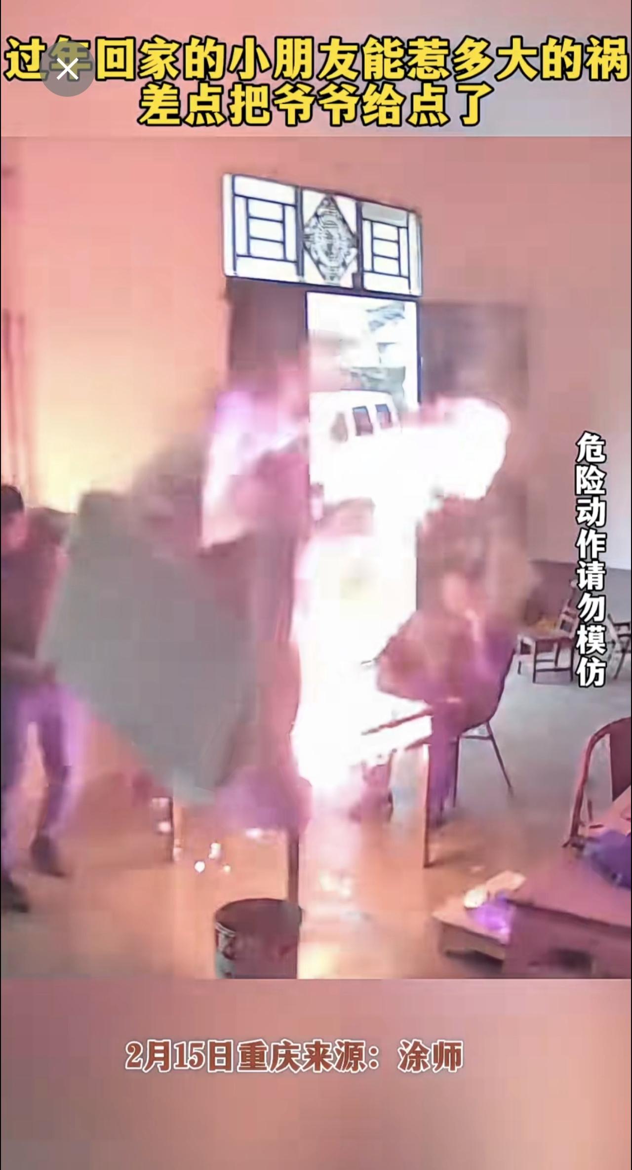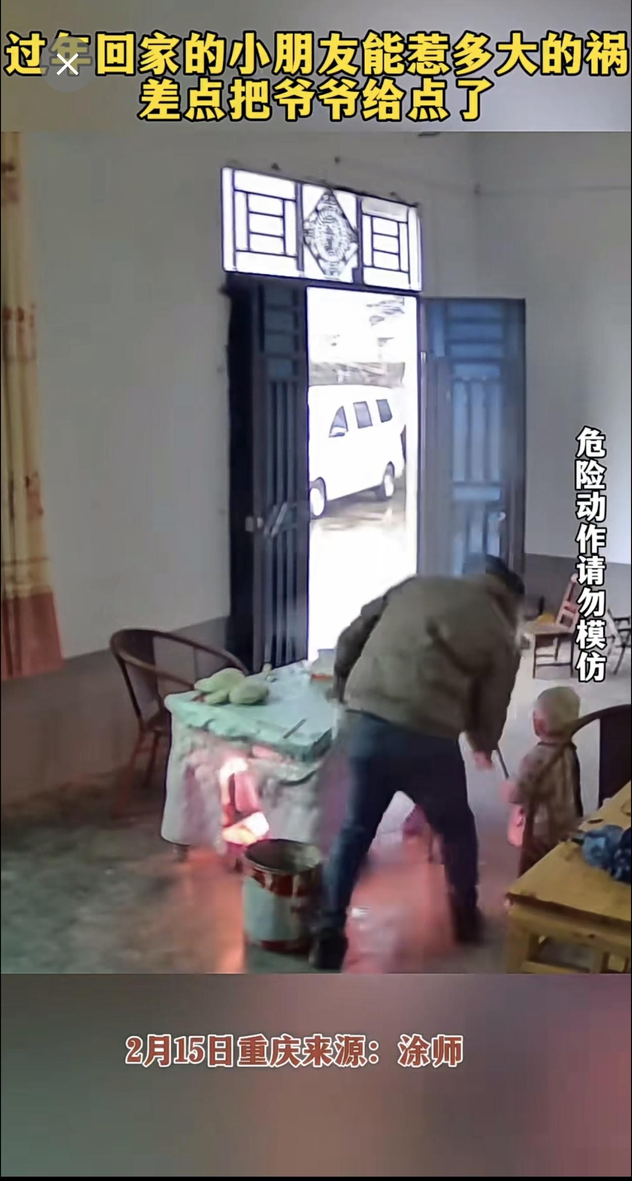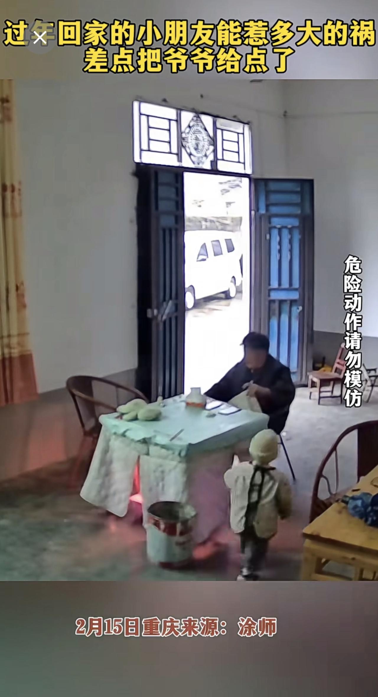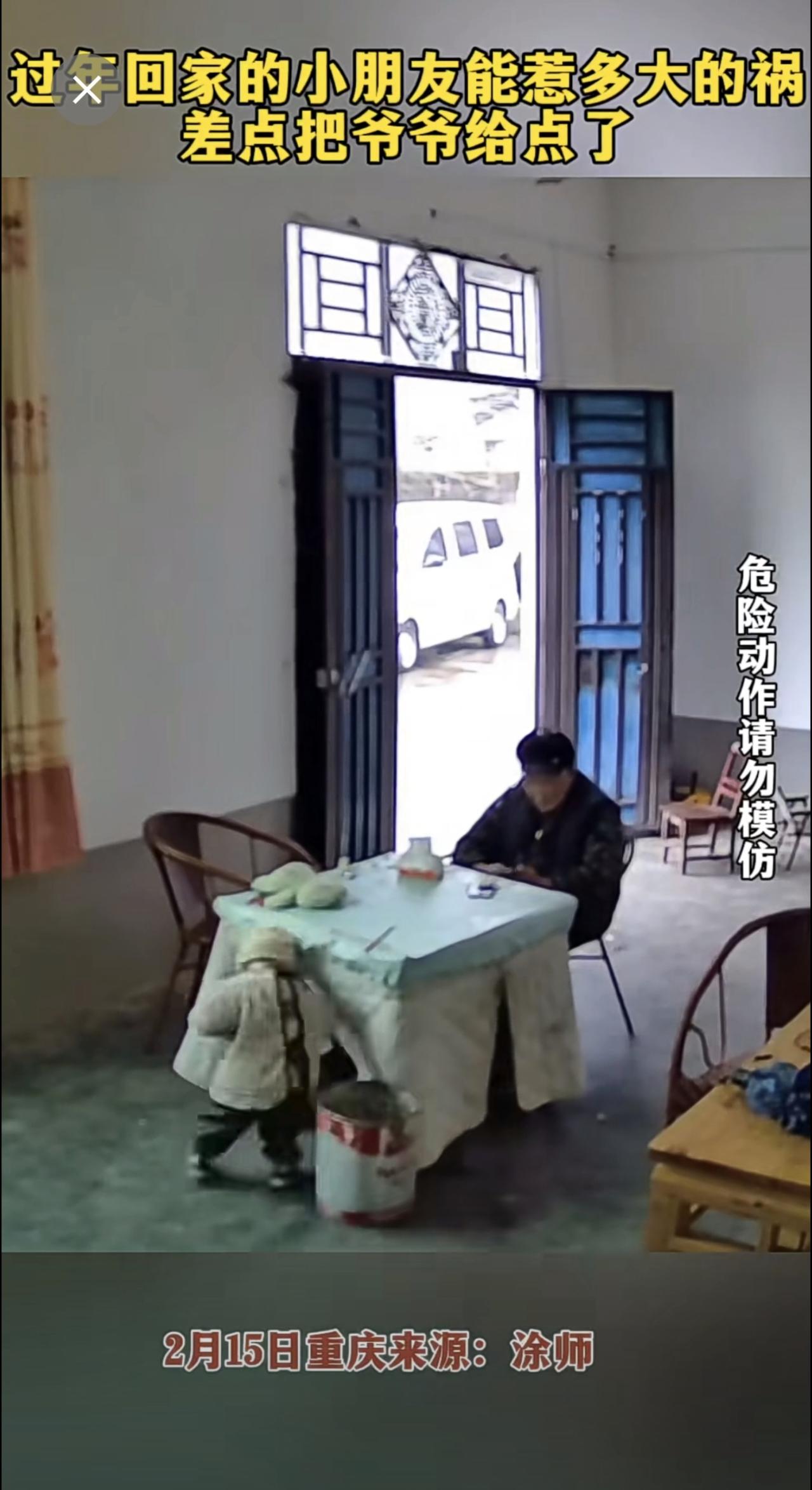 过年回家的小朋友能惹多大的祸,差点把爷爷给点了。