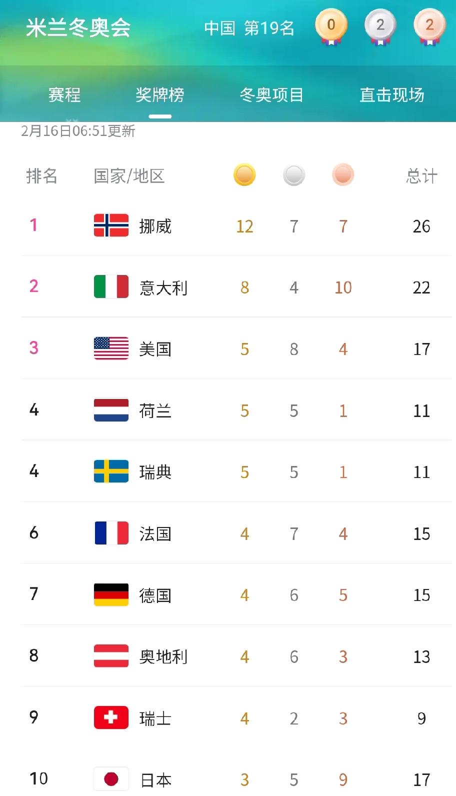米兰冬奥第九比赛日,挪威扩大领先优势,基本锁定本届榜首位置,东道主再度爆发,美国恐很难超越。 从比赛首日就高居榜首的挪威队今天狂揽2金4银,以12金7银7铜遥遥领先,金牌第一已经没有悬念,意大利今天收获2金1银1铜,以8金4银10铜拉开与美国队的差距,并刷新自己冬奥史上夺金记录(1994利勒哈默尔冬奥会7金),美国队今天很意外,颗粒无收,按照美国在赛会历史最多10枚金牌的表现(盐湖城冬奥),本届恐很难超越意大利第二的位置,日本队依然坚挺,以3金5银9铜稳稳地保持在TOP10,中国已经是连续三天一无所获,2银2铜继续排在第19,夺金希望渺茫,搞不好会掉出前20。 今天赛场表现最引人注目的是两名老将。挪威名将克莱博获得越野滑雪男子4×7.5公里接力金牌,以9枚金牌成为冬奥历史上夺金最多的选手;意大利老将布里尼奥内同样表现不凡,在高山滑雪女子大回转,抗住瑞典和挪威选手的强有力冲击,斩获金牌。